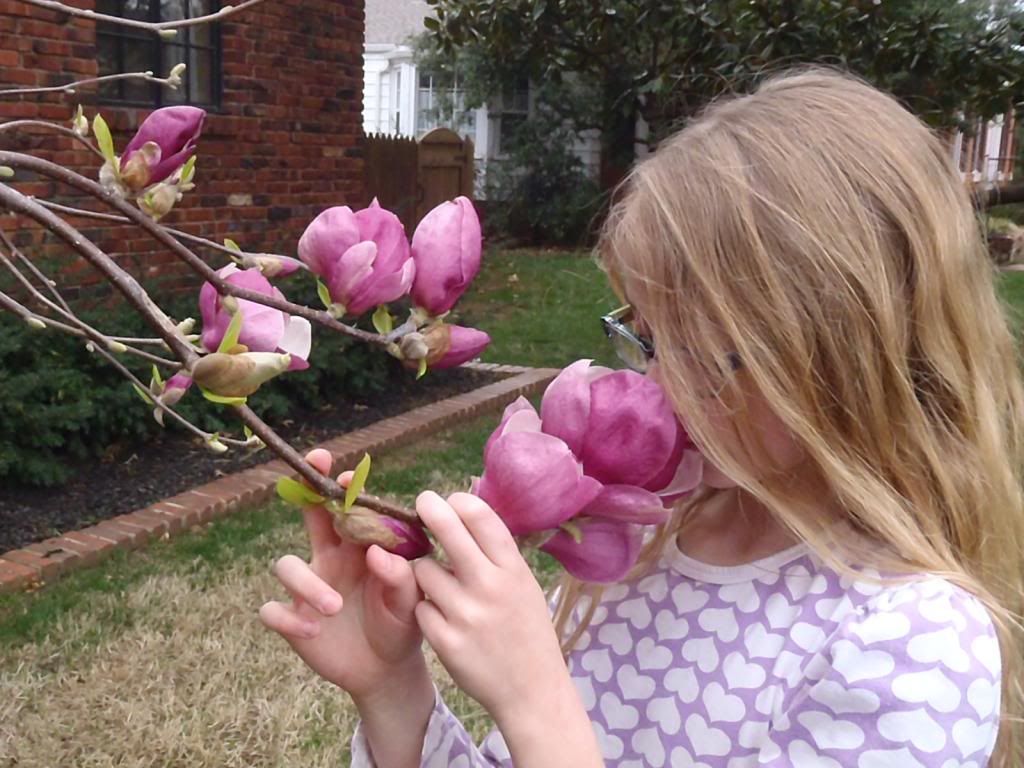 A little flower sniffing a little flower... adorable! Love the saucer magnolia, too. I've never heard of one... We planted some dwarf magnolia trees out by out pool and they are my new favorites! They have kind of a tall narrow silhouette, but the leaves and flowers are similar to the full sized trees. I think they get maybe 15 or 20 feet tall, but keep that narrow footprint. |