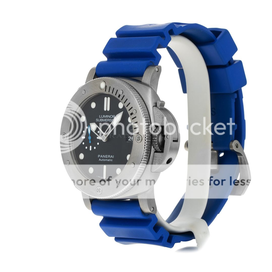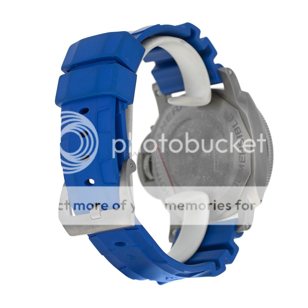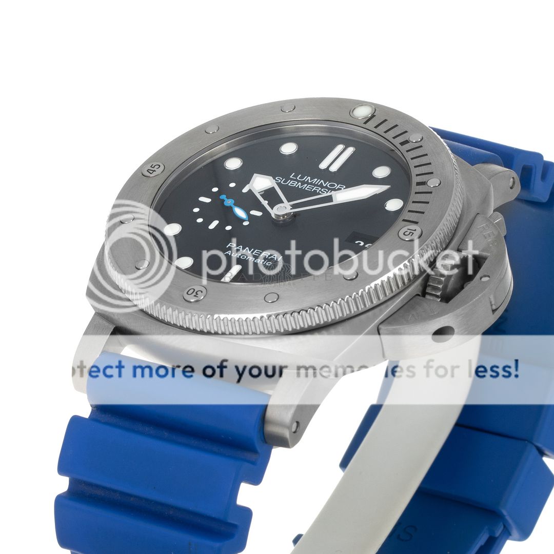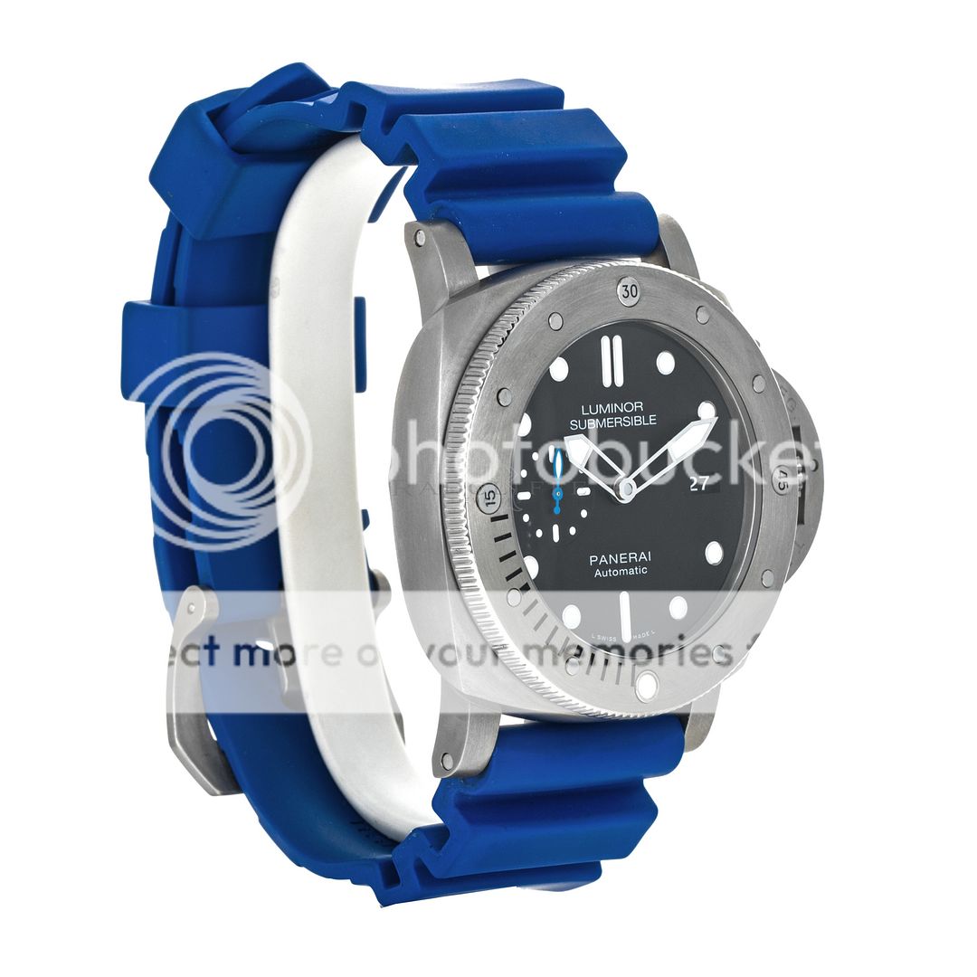 For sale is a pre-owned near mint condition 47mm titanium Panerai Luminor Submersible. This sale of the U serial PAM1305 will be accompanied by a box set and papers. This includes the inner and outer Panerai box set, a bezel protector, serialized hang tag, instruction booklet, and the certificate booklet dated 2018. The Submersible’s black dial features luminescent round indices, luminescent skeleton hands, a small seconds sub dial at the nine o’clock position, and a date aperture at the three o’clock position. The brushed titanium case is in near mint condition with no notable imperfections. The Submersible is affixed with a unidirectional coin edge titanium bezel and is mounted on an OEM blue corrugated rubber strap with a brushed titanium tang buckle. Powering the Submersible is an automatic movement, caliber P.9010, with approximately 72 hours of power reserve.