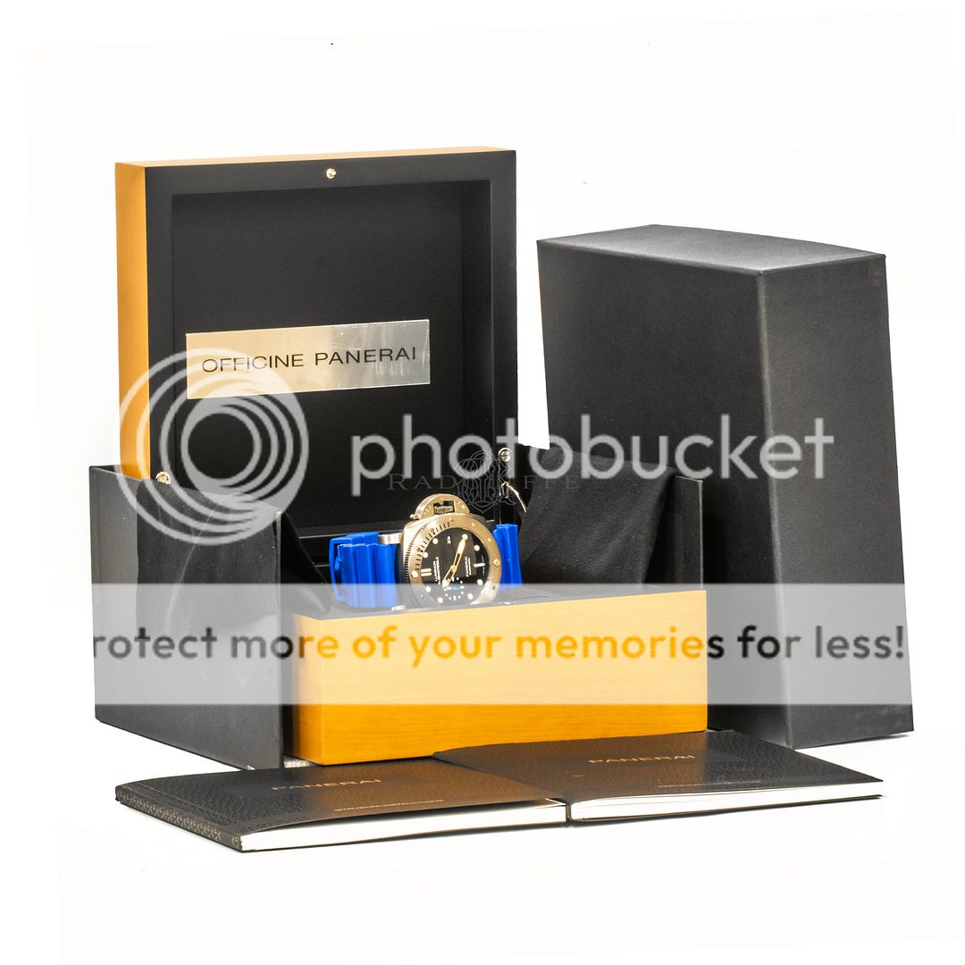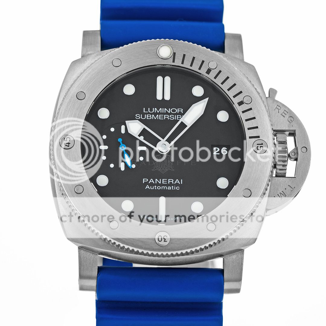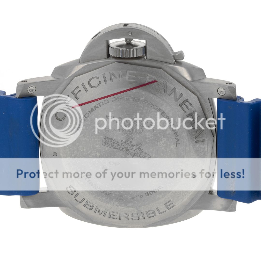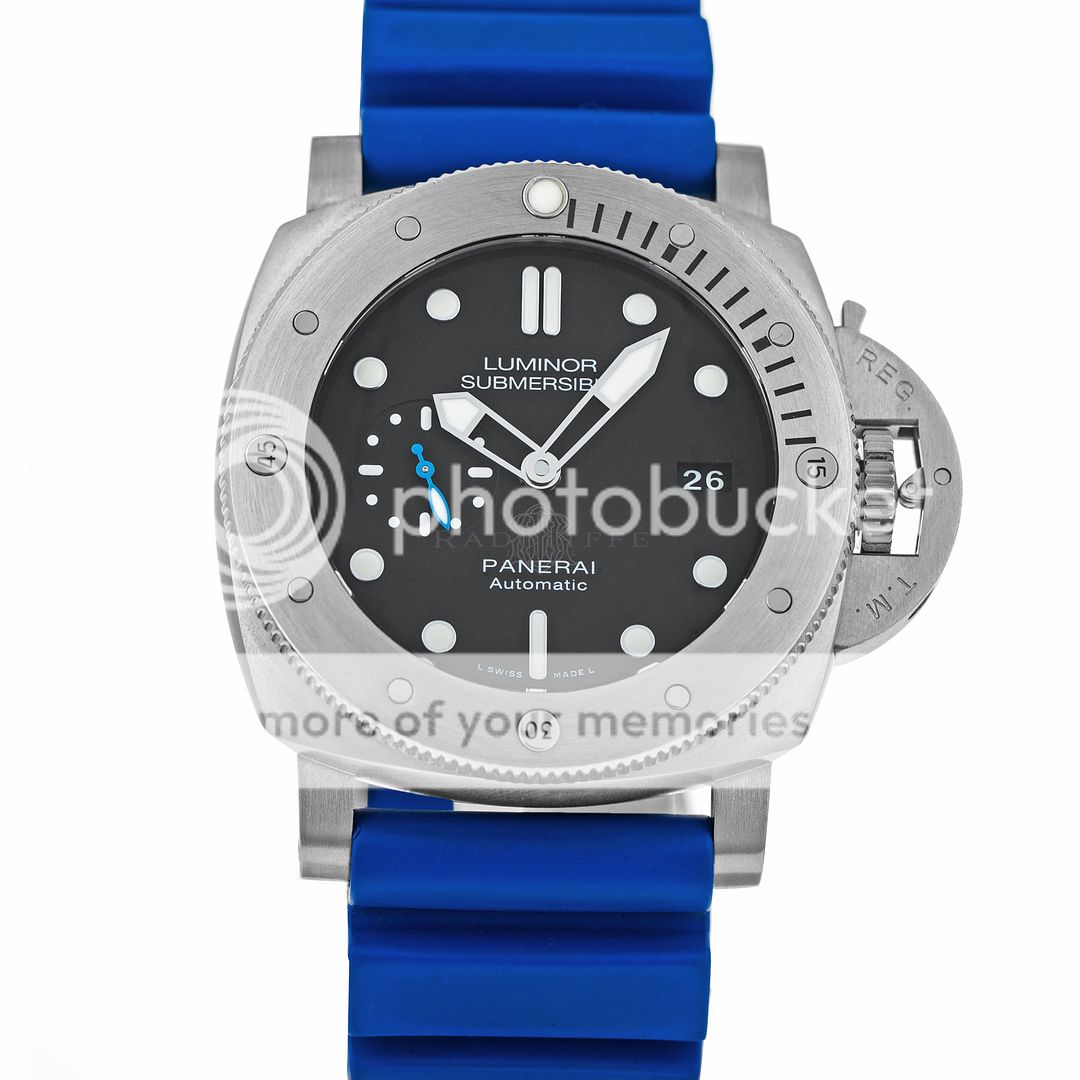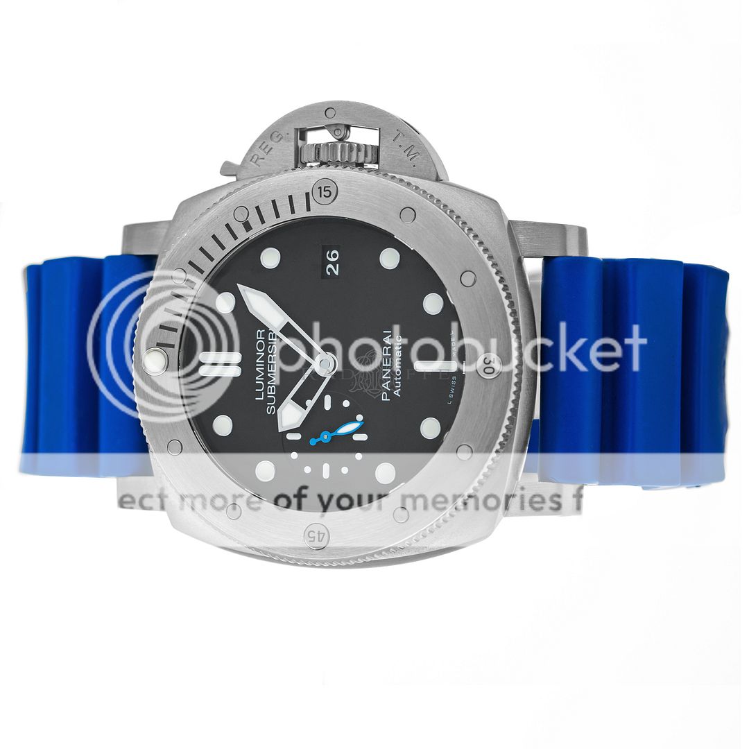 For sale is a pre-owned near mint condition 47mm titanium Panerai Luminor Submersible. This sale of the U serial PAM1305 will be accompanied by a box set and papers. This includes the inner and outer Panerai box set, a bezel protector, serialized hang tag, instruction booklet, and the certificate booklet dated 2018. The Submersible’s black dial features luminescent round indices, luminescent skeleton hands, a small seconds sub dial at the nine o’clock position, and a date aperture at the three o’clock position. The brushed titanium case is in near mint condition with no notable imperfections. The Submersible is affixed with a unidirectional coin edge titanium bezel and is mounted on an OEM blue corrugated rubber strap with a brushed titanium tang buckle. Powering the Submersible is an automatic movement, caliber P.9010, with approximately 72 hours of power reserve.