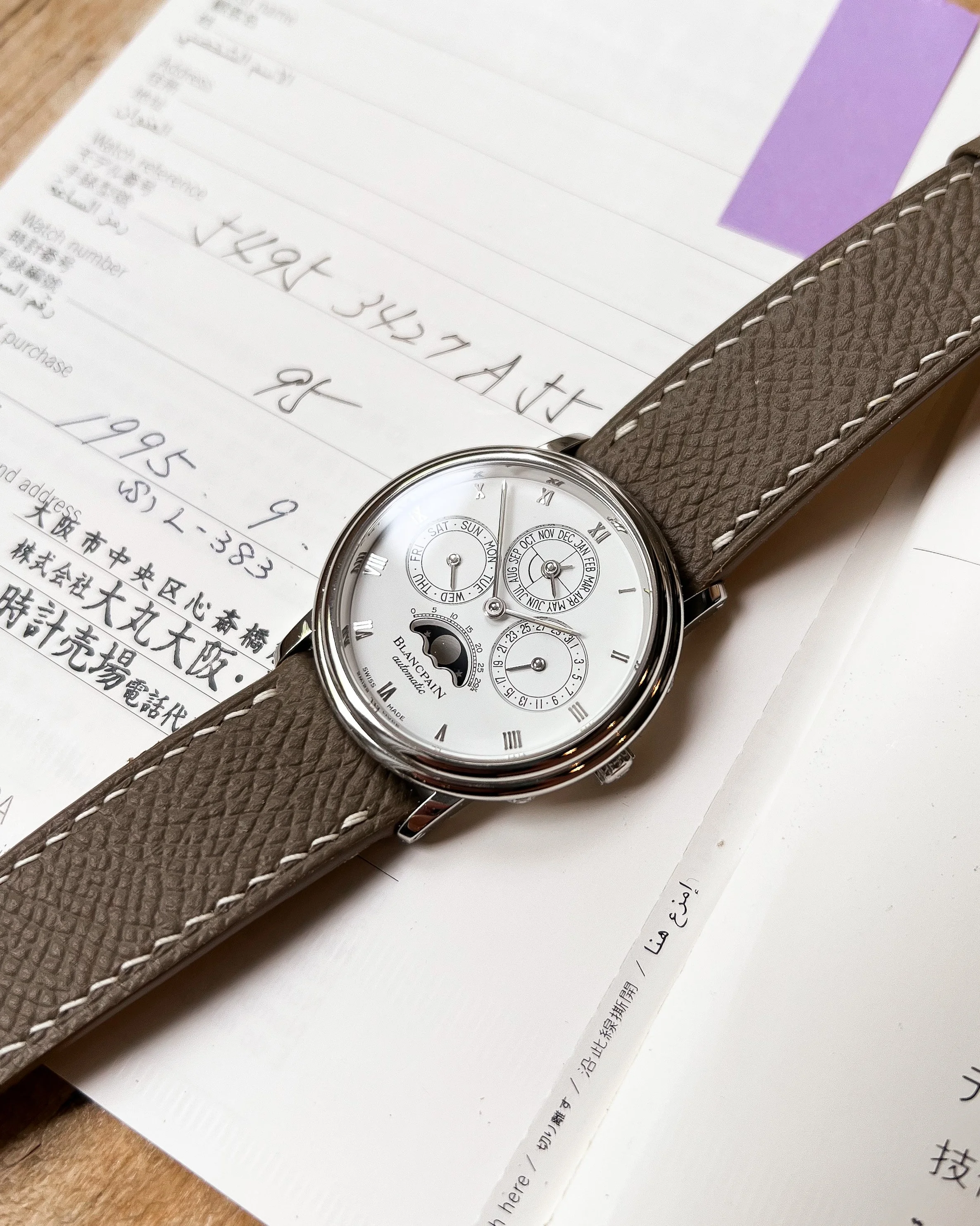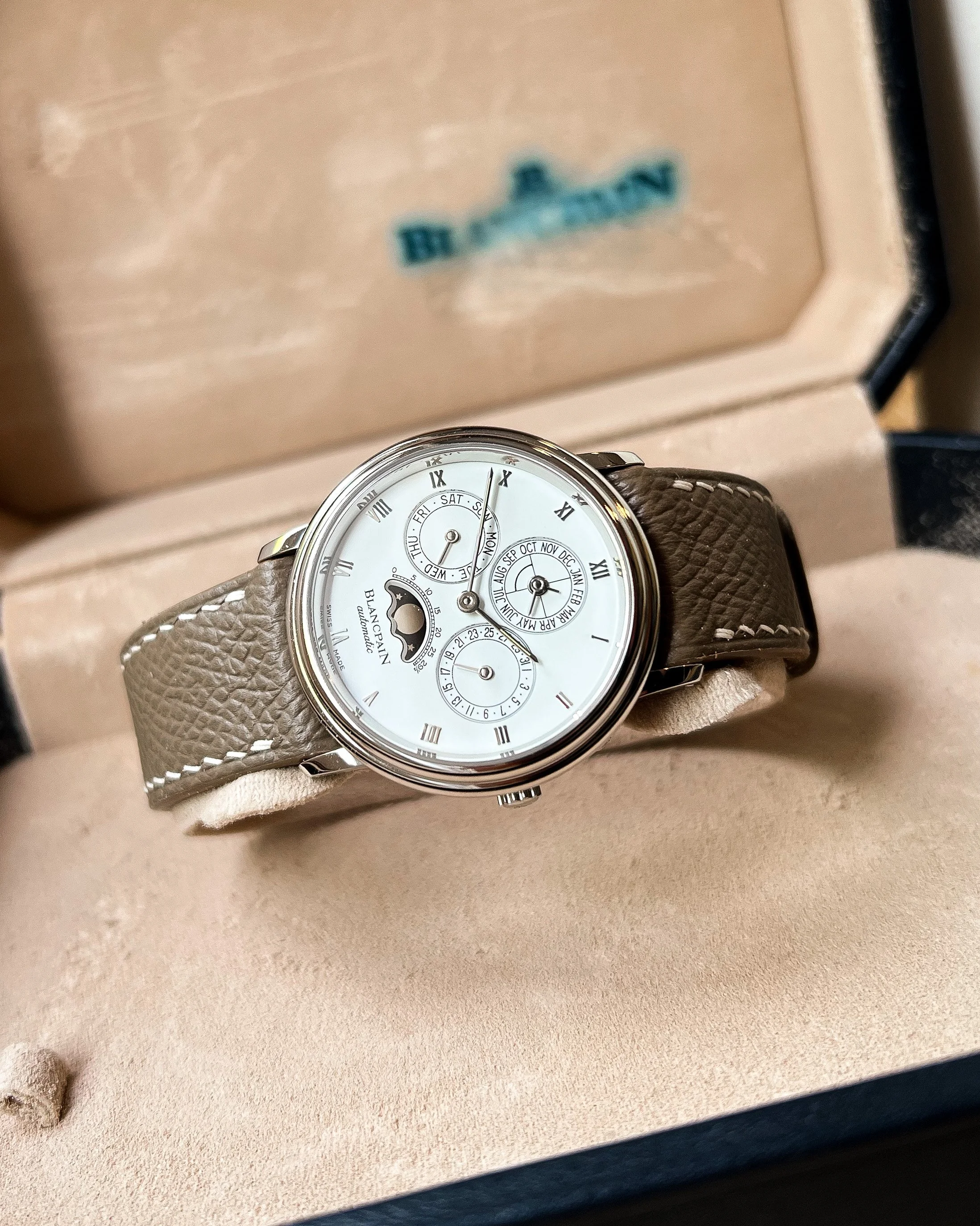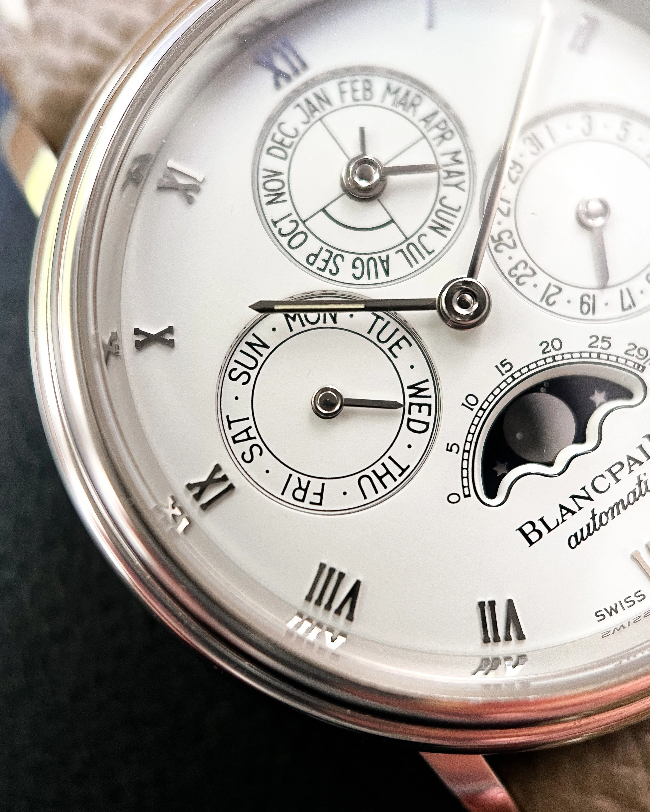 Description: We’re proud to offer this 34mm platinum perpetual to the Sales Corner being such passionate collectors of the complication ourselves and a somewhat forgotten model from the neo-vintage era. When looking at similar market offerings from other brands it’s hard not to find this a rather appealing value proposition. Read all about neo-vintage Blancpain in our article.