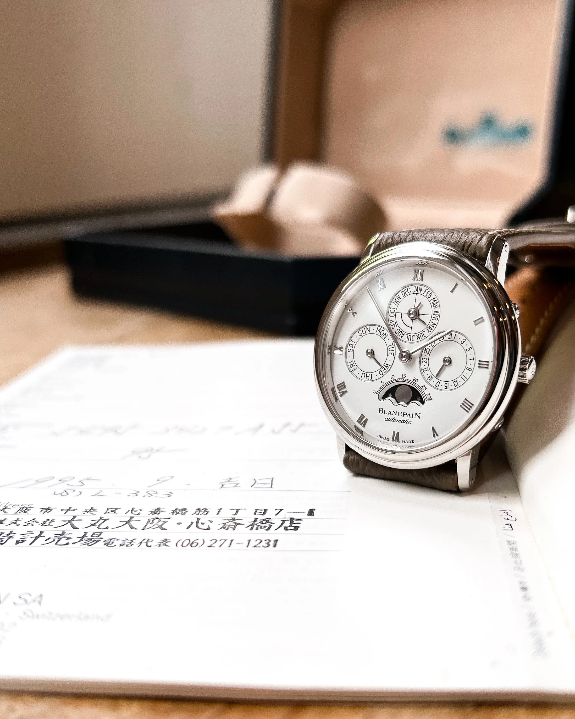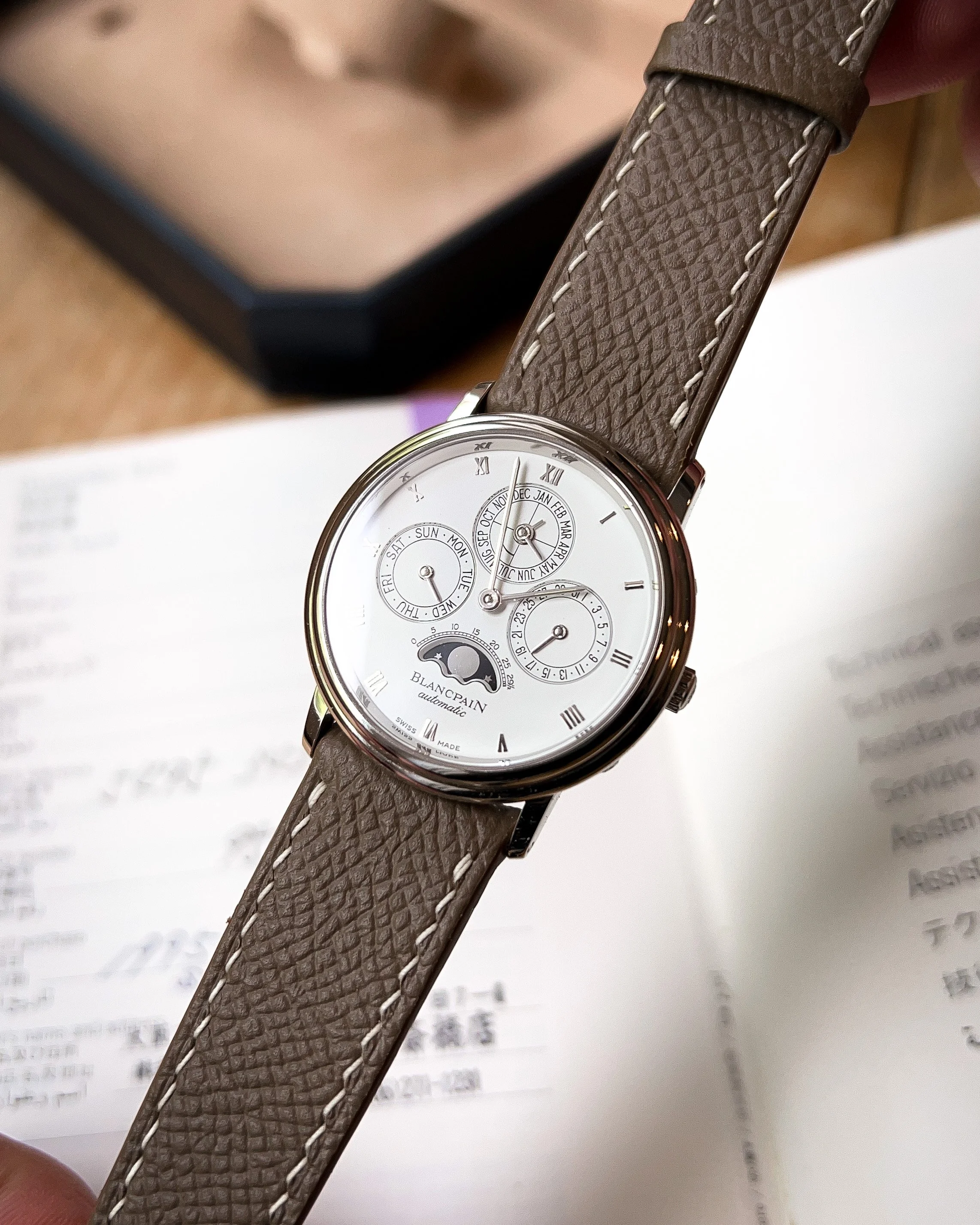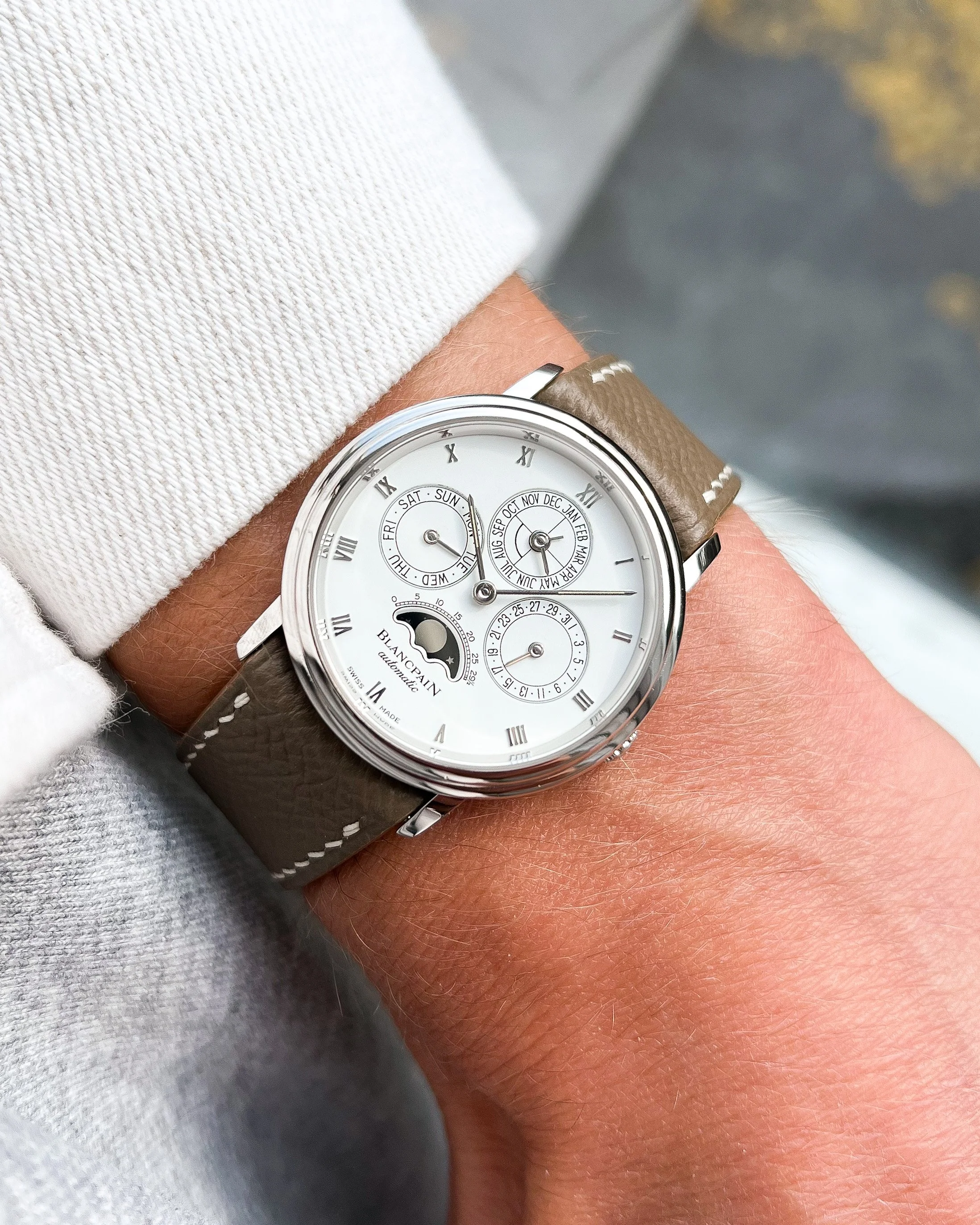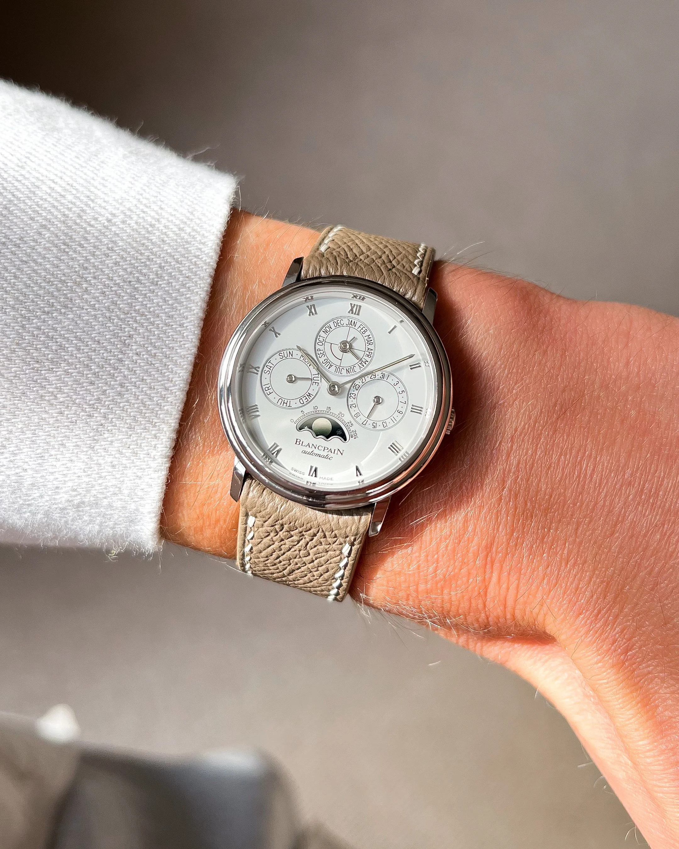 Description: We’re proud to offer this 34mm platinum perpetual to the Sales Corner being such passionate collectors of the complication ourselves and a somewhat forgotten model from the neo-vintage era. When looking at similar market offerings from other brands it’s hard not to find this a rather appealing value proposition. Read all about neo-vintage Blancpain in our article.
