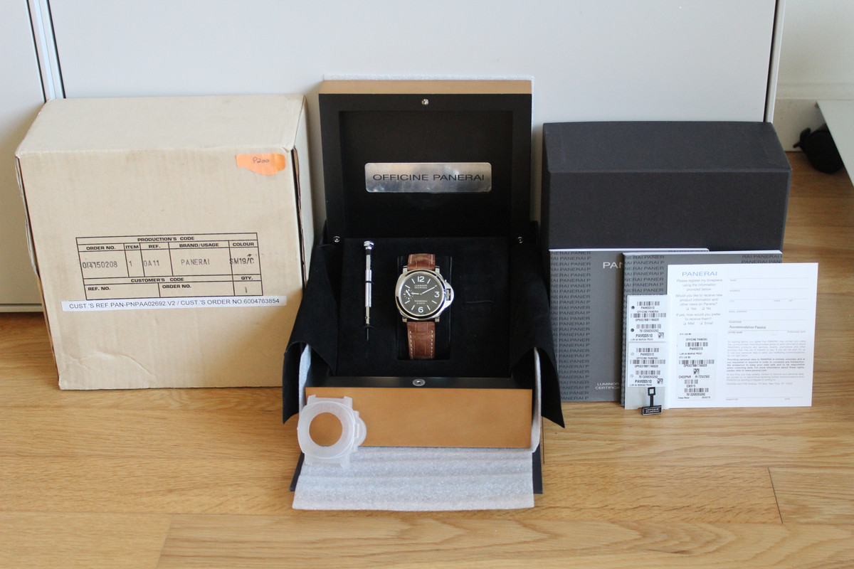 -INCLUDES BOX + PAPERS Amazing opportunity to acquire a Panerai PAM 510 (44mm Luminor Marina) with boxes and papers! This watch is a R serial number. This watch comes with everything pictured including: -Boxes: --Cardboard outer box (with stickers) --Black cardboard outer box --Pearwood box -Papers: --Panerai instruction booklet --Panerai guarantee booklet (note: open booklet / no name or date - RARE) --Panerai registration card (note: blank / no name filled in - RARE) -Bands: --OEM brown alligator / crocodile print band (pictured, on watch) on OEM tang buckle -Other: --OEM rubber bezel protector --Black plastic part of hang tag --OEM screwdriver This watch is guaranteed to be 100% authentic. I take high quality photos so that you can see the piece as close to being in person as possible. I took photos of the watch from every angle I could think of. Shipping is inured with tracking and signature confirmation. Item will only be shipped to verified addresses, via UPS or FedEx, no P.O. boxes. All watches are used and may have wear resultantly; please review photos. All watches are sold as-is. We are a private seller that is not affiliated with any of the brands we carry in any way. Internal Code: P200 Price: $4,250 + shipping Email: UptownWatchesLLC@gmail.com ![]() ![]() ![]() ![]() ![]() |