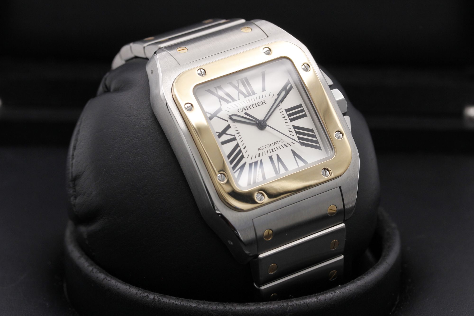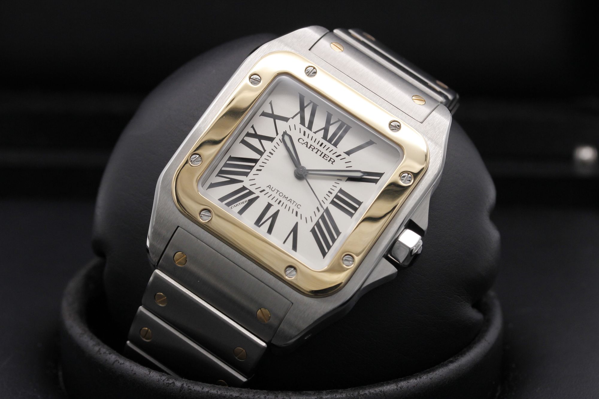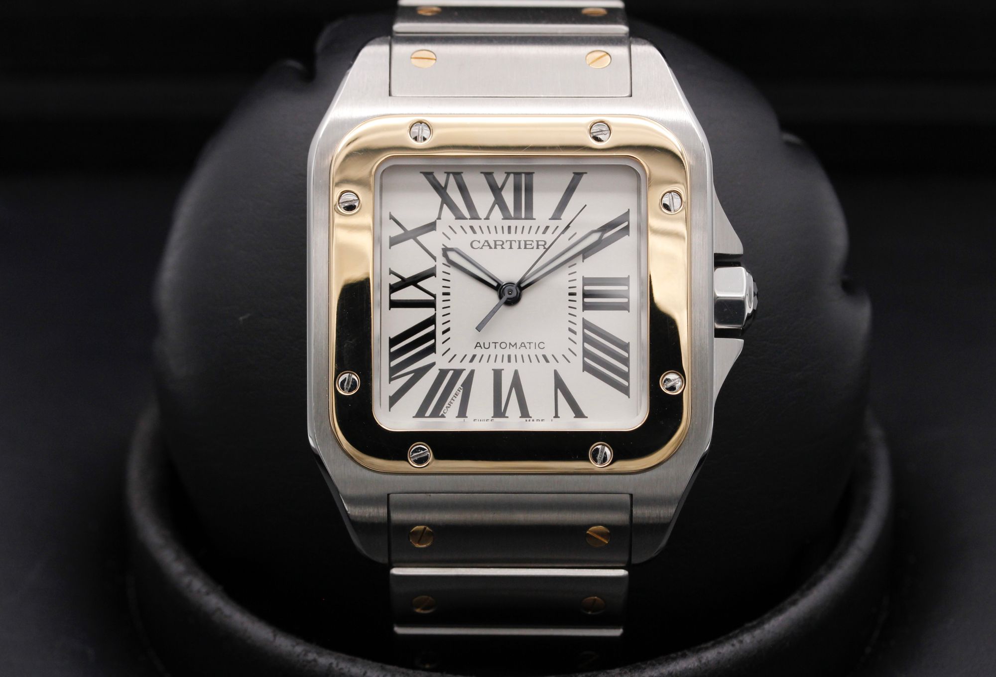 Brand: Cartier Model: Santos 100 XL Case Size: 38mm x 51mm Condition: Pre-Owned Grade: Mint Bracelet Type: Two Tone Yellow Gold Material: Two Tone Yellow Gold Dial: Silver Age: Modern Movement: Automatic Papers: No Box: No Reference: W200728 or 2656 **Please Note** The serial numbers have been blurred in the photos, for security & privacy. However, they are fully present. Wire Price $8,295.00 Shipped and Insured in the CONUS Many world wide references available All Watches Are Available For Inspection or Pickup By Appointment At: OC Watch Guy 16832 Pacific Coast Highway Huntington Beach, CA 92649 562.592.6294 I am open to trades of 1ct & up GIA Diamonds, modern Rolex, Panerai, Audemars Piguet, Patek Philippe & IWC watches! I welcome a face to face in Southern California I am always a cash buyer for your 1ct & Up GIA Diamond, New or Pre-Owned Rolex, Audemars Piguet or Patek Philippe For questions please call/text Patrick: 714-353-9539 email: Patrick@ocwatchguy.com or Info@ocwatchguy.com *All my watches are guaranteed authentic and I standby their authenticity, 100%!