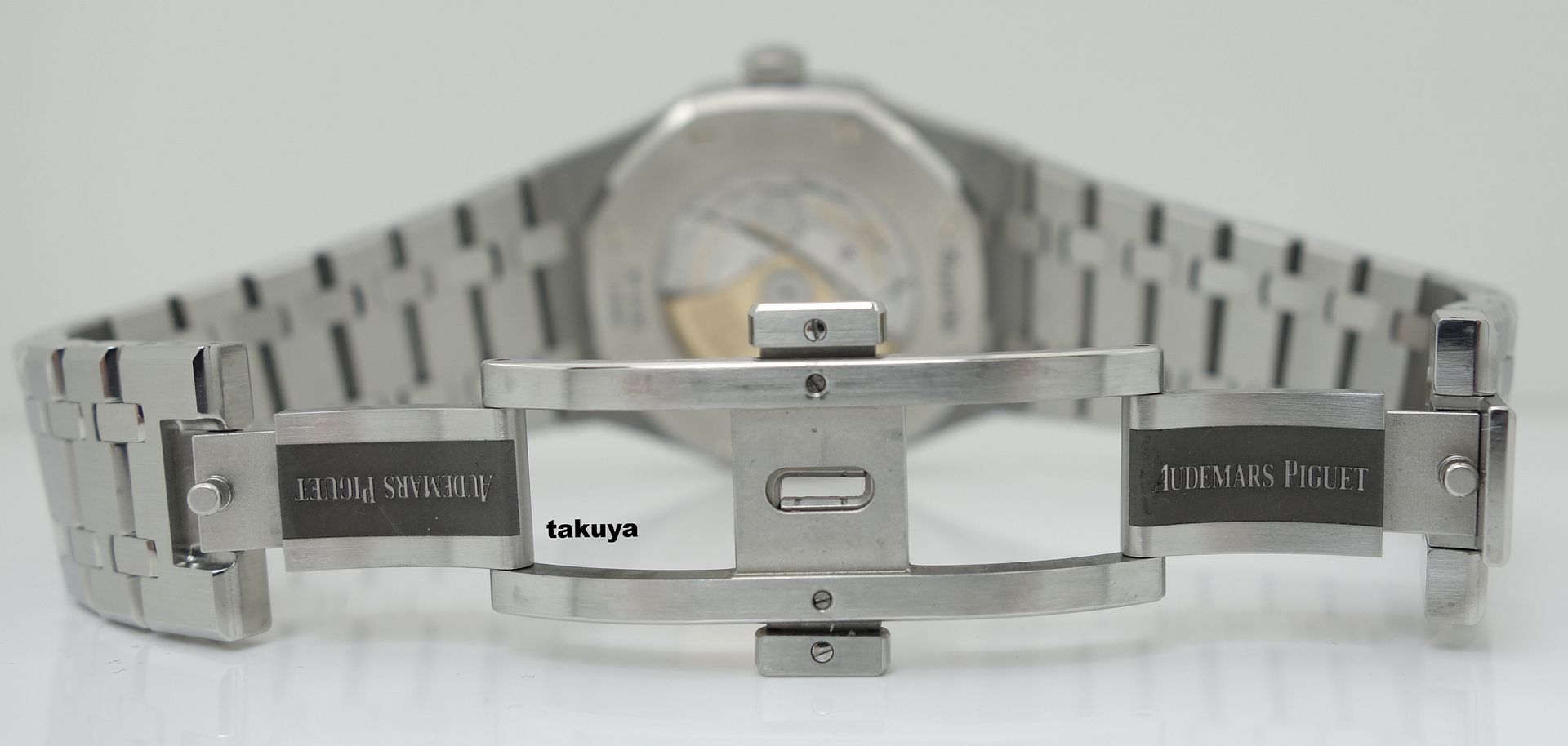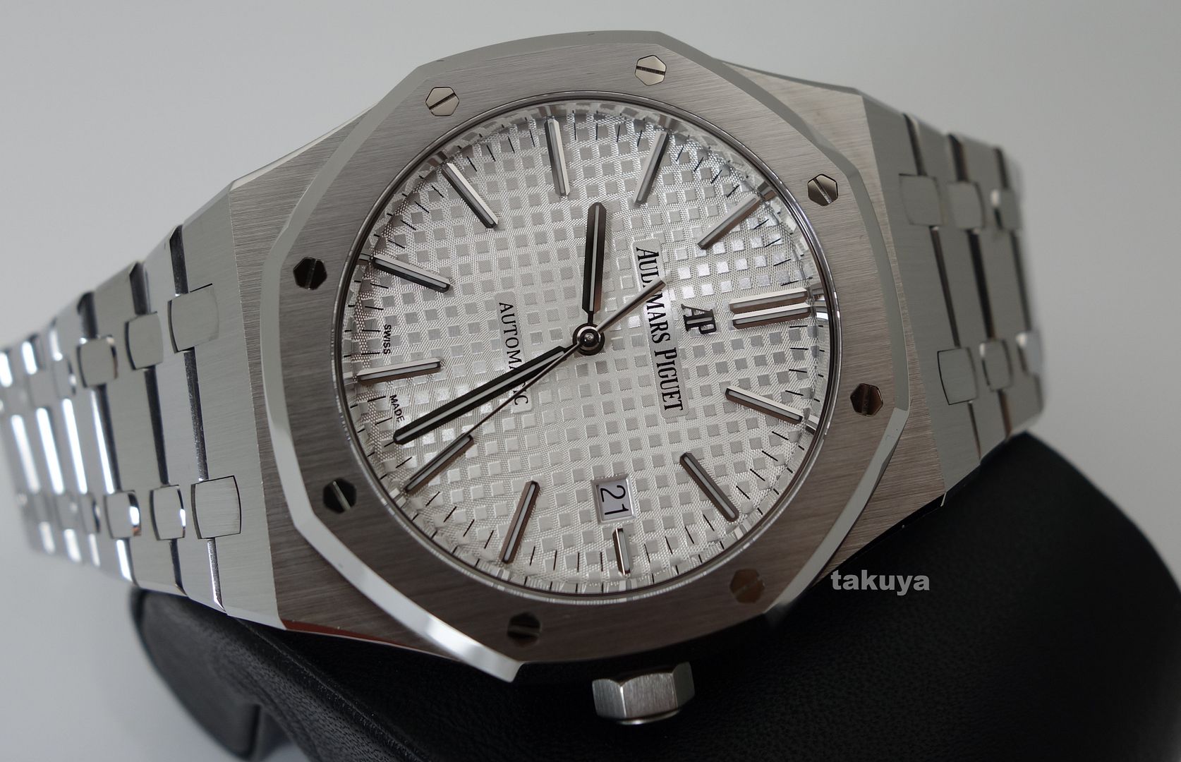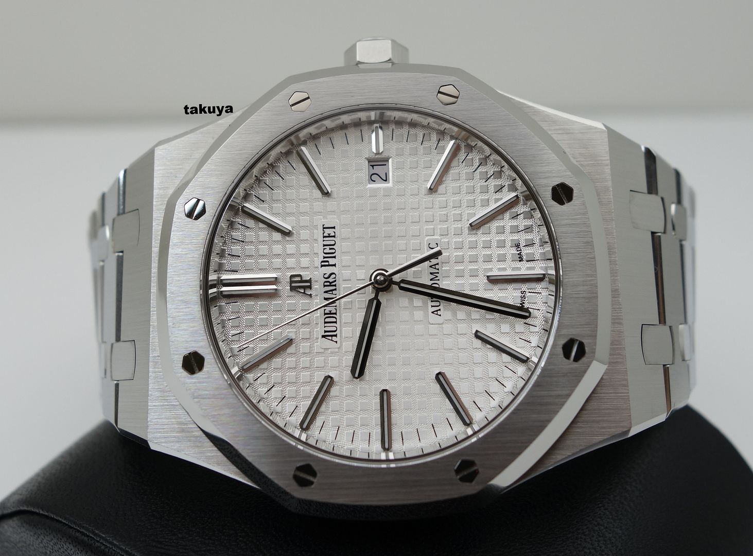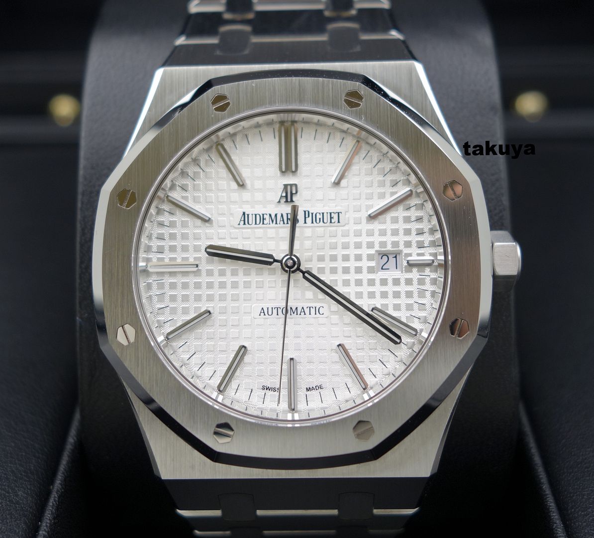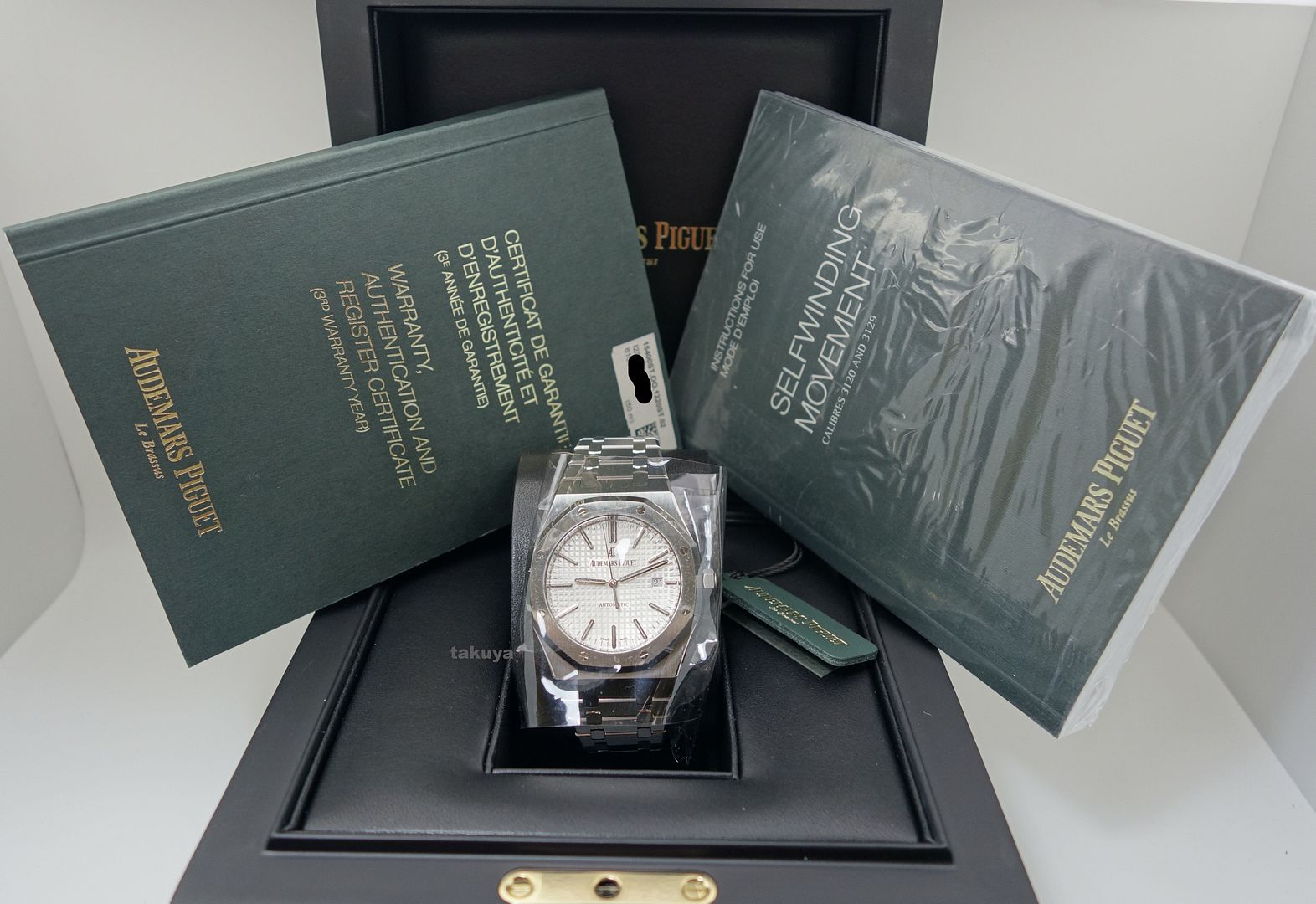 Ref: #15400STOO1220ST02 I Series .Brushed finished stainless steel case & bracelet with polished bevel edges. .Silver dial with the Grande Tapestry design pattern. .Applied polished white gold index hour markers with luminescent fill. .Polished white gold baton hands with luminescent fill. .Bi-directional 22kt gold rotor with ceramic ball bearings. Rotor bears both the AP design logo & the the Audemars/Piguet families crests. .Movement: AP Caliber 3120 beats at 21,600 vph, contains 40 Jewels, composed of 280 parts & has an approximate power reserve of 60 hours. .Case Back: Transparent (See-Through) Complete Packages/Set (double boxes, hangtag) and Complete Manual/Papers with Warranty Booklet has AP USA AD's Name Printed and Dated 09.2014. The Watch Still has Plenty of Factory Warranty Left. Selling at ONLY $12375 Included Fedex Overnight Shipping in US with Full Insured. TRADES +/- are always WELCOME (Preferred PP/AP/Rolex/Iwc/Panerai/Modern Trades). Payment: bank wire transfer/cashier check/money order or Paypal add PP fees. Face To Face Deal around Texas (Houston/San Antonio). So Many Solid References on TRF (Who's Who Section)/WUS/Paneristi/Good Guys/WWF under my id or my real name, or on another forums. International Buyers are welcome (please ask for the additional shipping fees). IF you have any questions or concerns: Email: bithanh_84@hotmail.com *no space, there is only one underscore* Cell: (614)804-3764 I am just a watch collector and independent watch seller. And I am not affiliated with AP USA in anyway. My watches comes from various dealers in the US and all around the world. All my watches are guaranteed authentic and will stand by its Authenticity. THE PHOTOGRAPHS ARE OF THE EXACT ITEM UP FOR SALE. Everything Pictured: ![]() ![]() ![]() ![]() ![]() ![]() ![]() ![]() ![]() ![]()