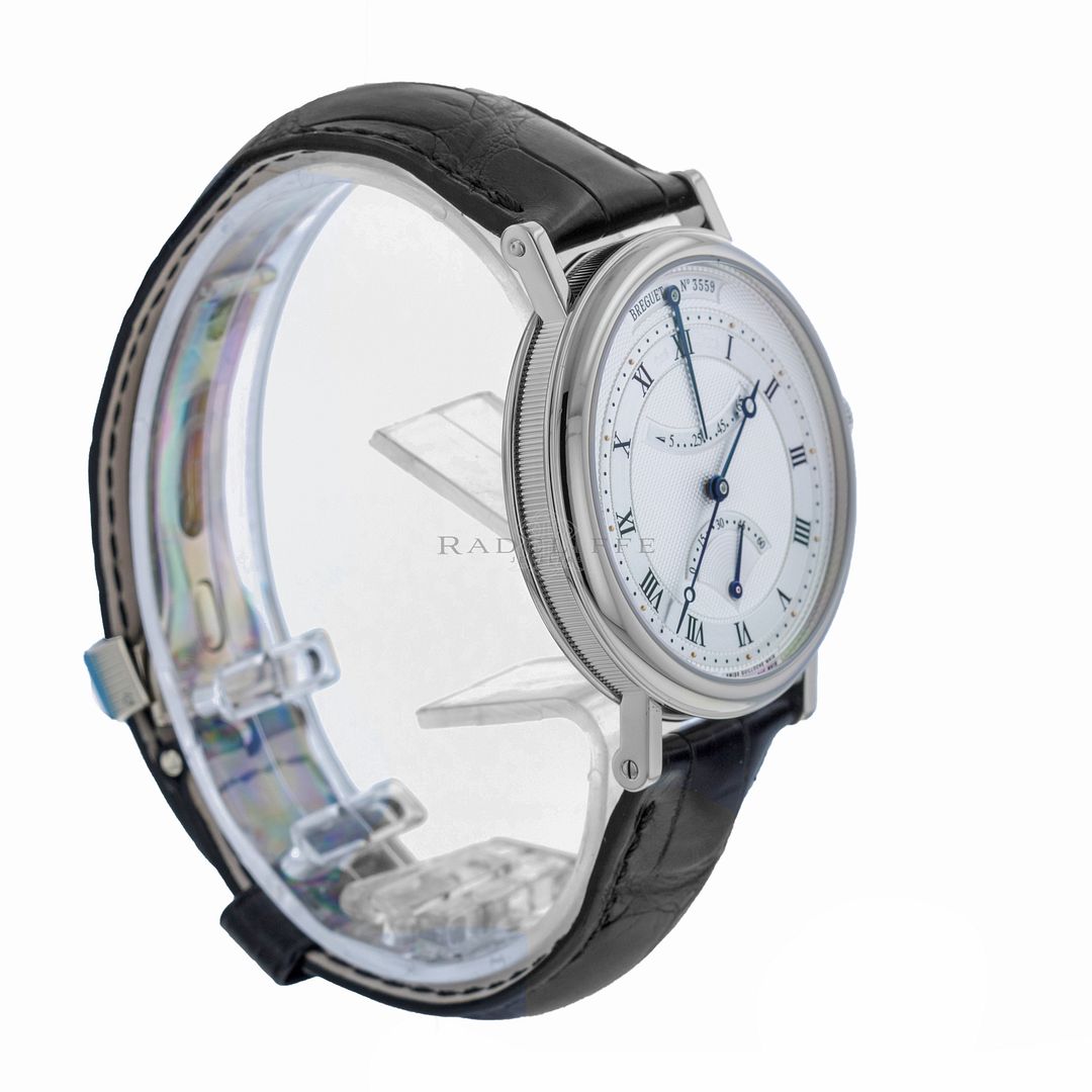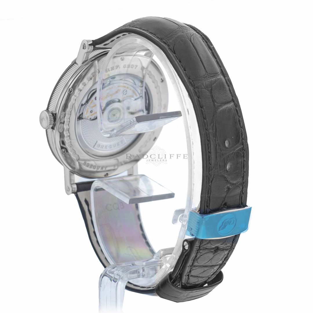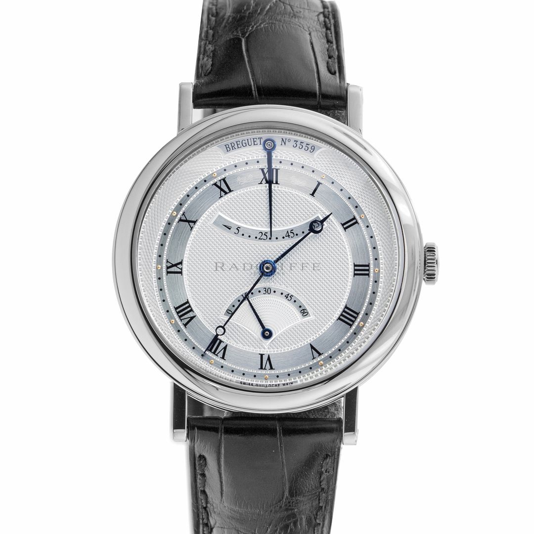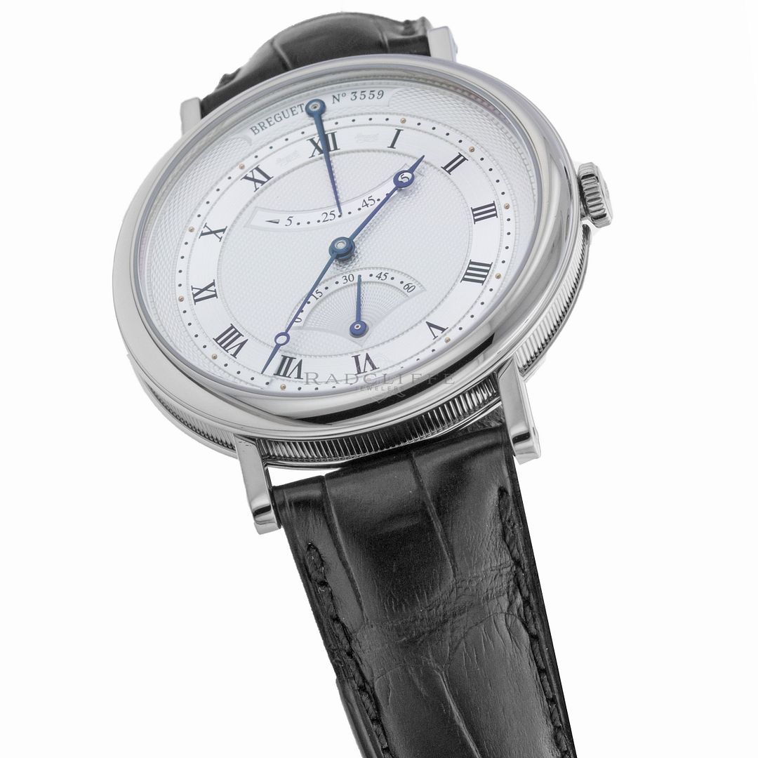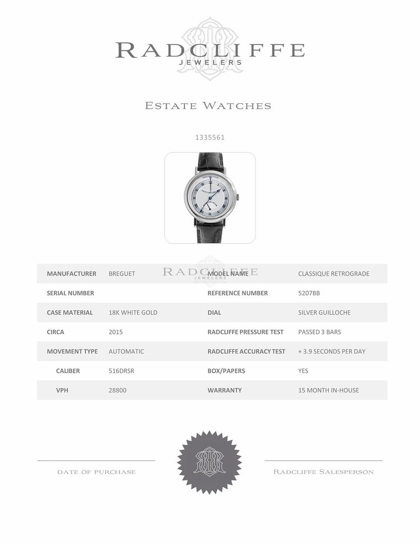 For sale is an excellent condition 39mm 18 karat white gold Breguet Classique Reserve. The 5207BB /12/9V6 comes with box and papers. The Classique was originally purchased in 2015; included in the set are the instruction manual, certificate of warranty, and open registration forms. The Classique is on OEM black alligator strap in excellent condition and original 18 karat white gold deployment buckle. The 5207 features a silver guilloche dial with to retrograde displays. The 65 hour power reserve is on display in the upper half of the dial and a 30 second jump register is at the bottom haf of the dial.