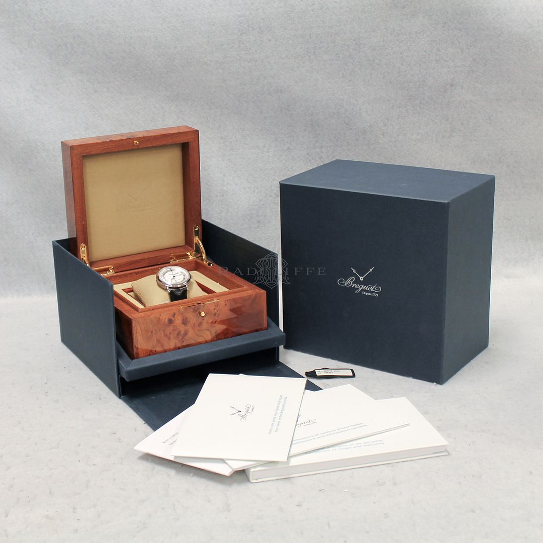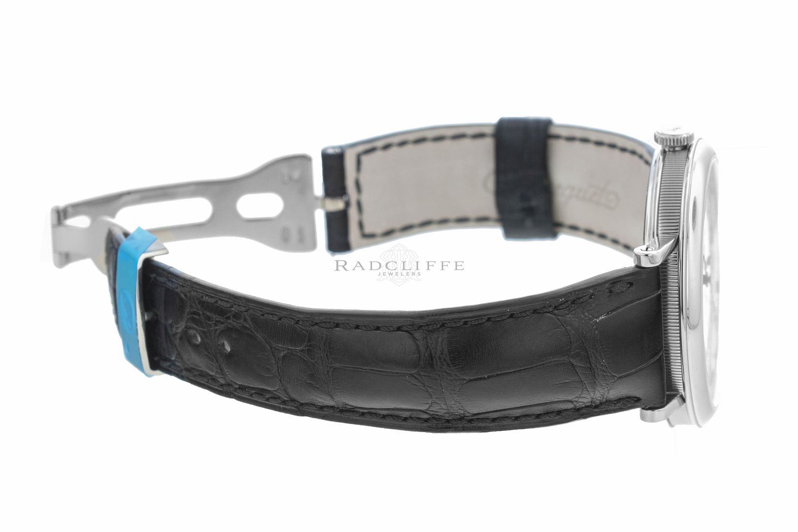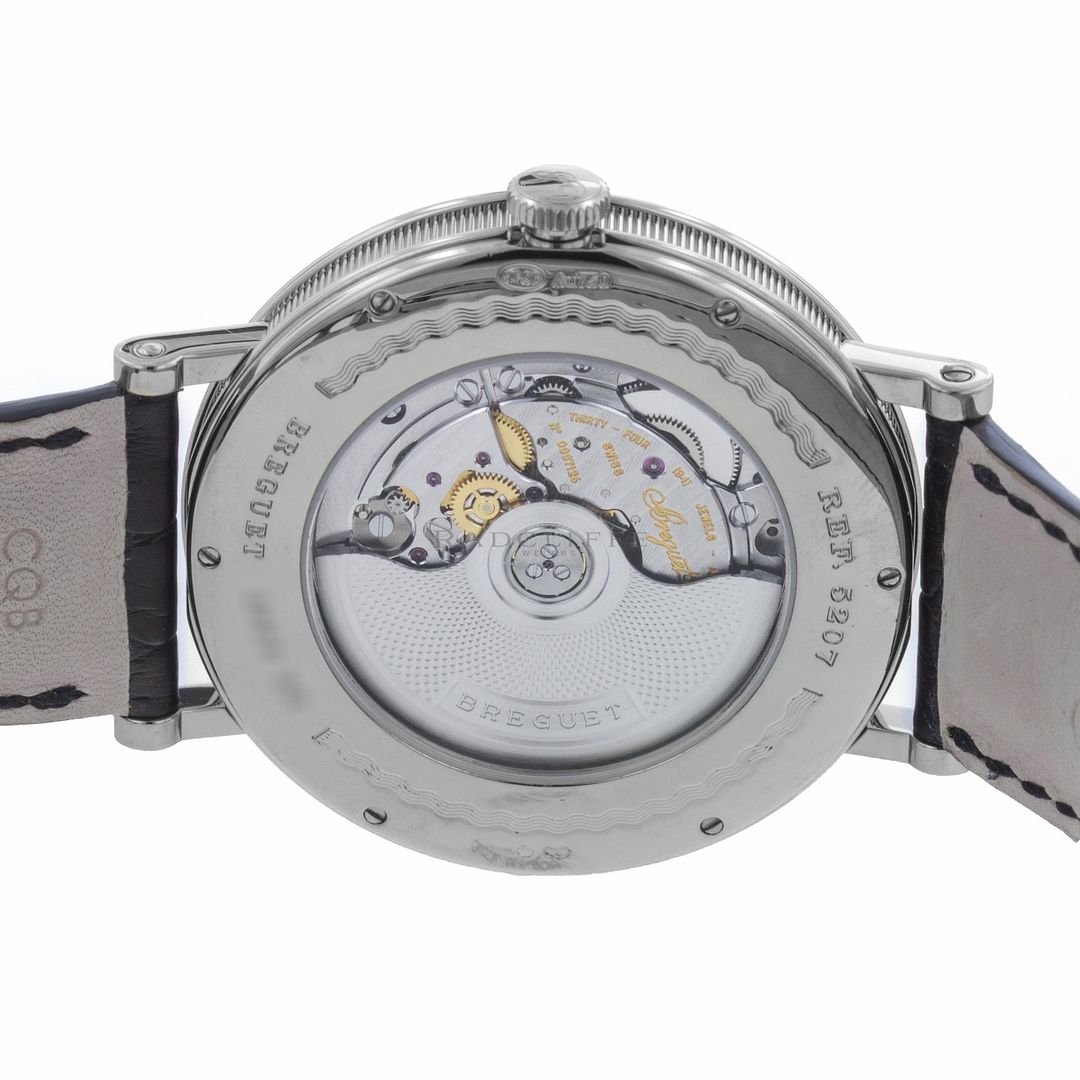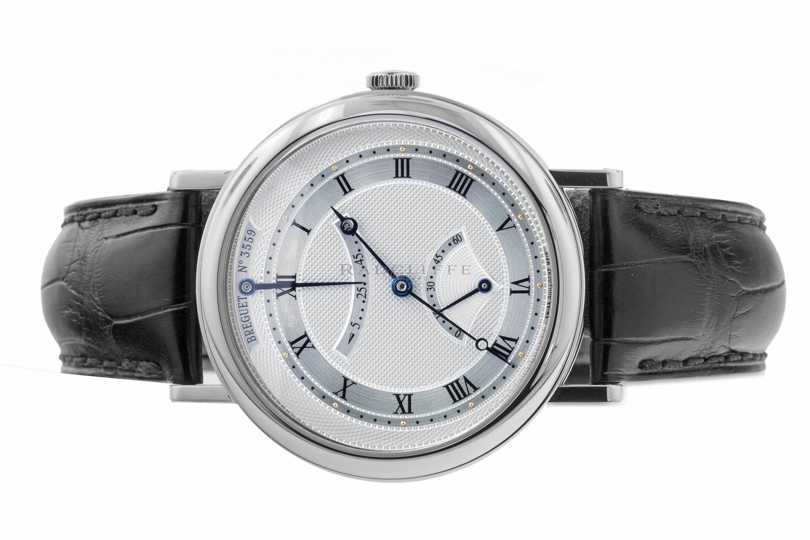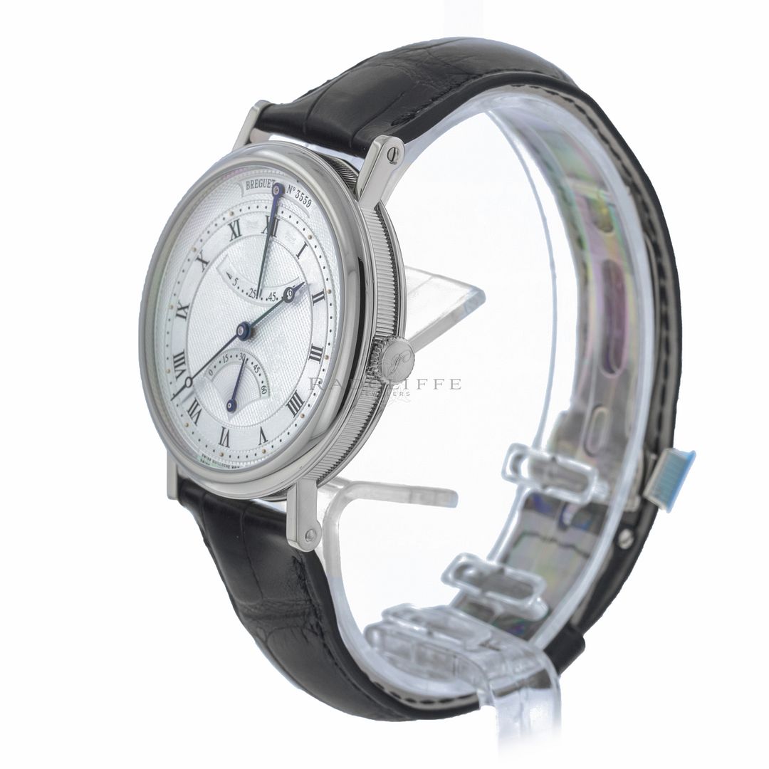 For sale is an excellent condition 39mm 18 karat white gold Breguet Classique Reserve. The 5207BB /12/9V6 comes with box and papers. The Classique was originally purchased in 2015; included in the set are the instruction manual, certificate of warranty, and open registration forms. The Classique is on OEM black alligator strap in excellent condition and original 18 karat white gold deployment buckle. The 5207 features a silver guilloche dial with to retrograde displays. The 65 hour power reserve is on display in the upper half of the dial and a 30 second jump register is at the bottom haf of the dial.