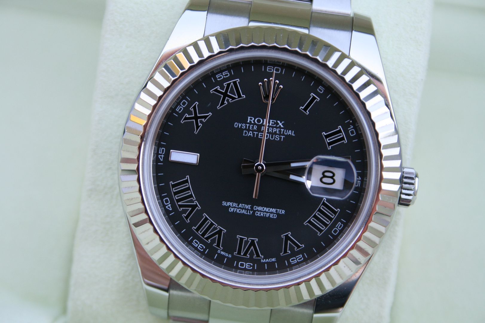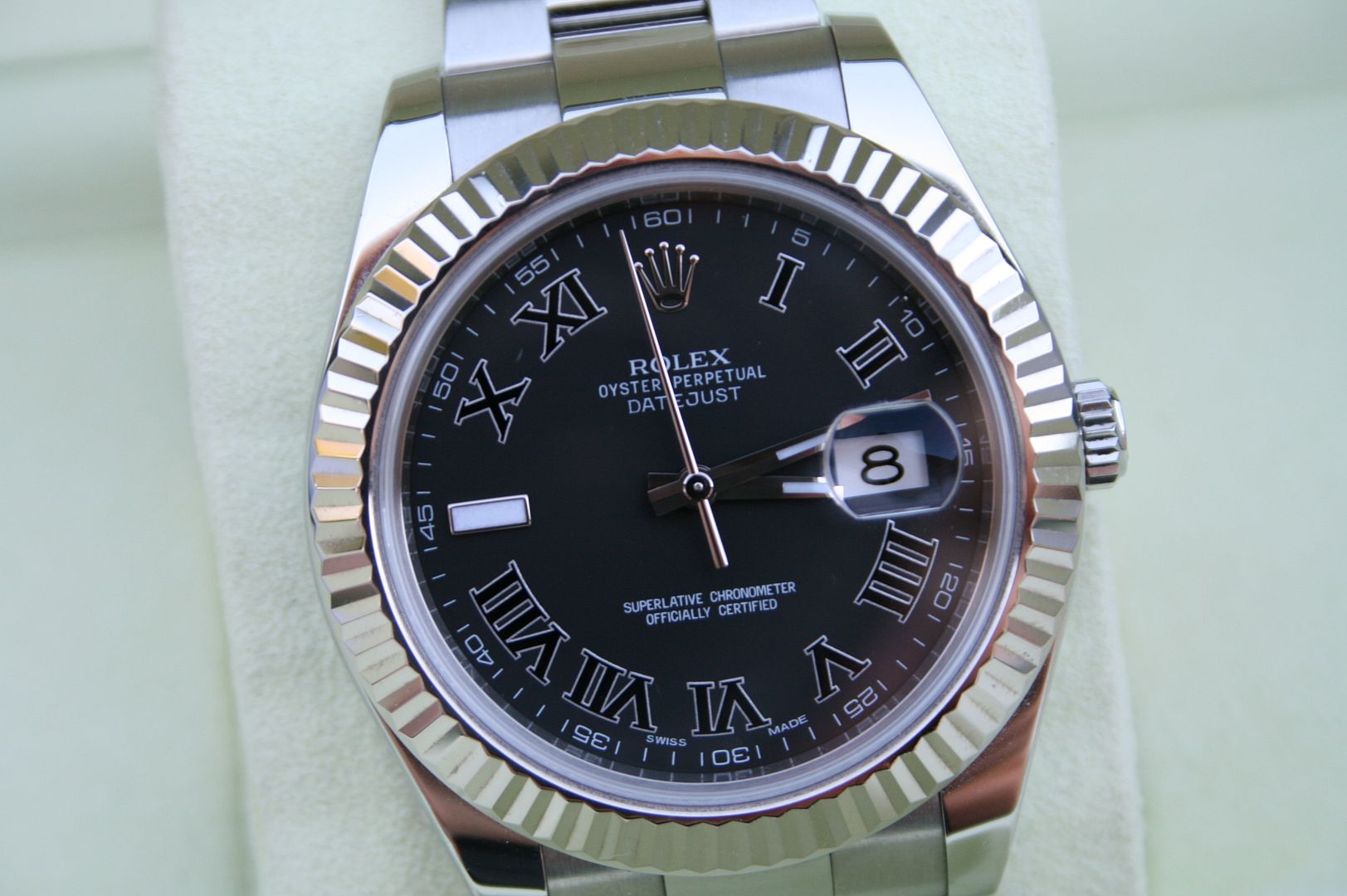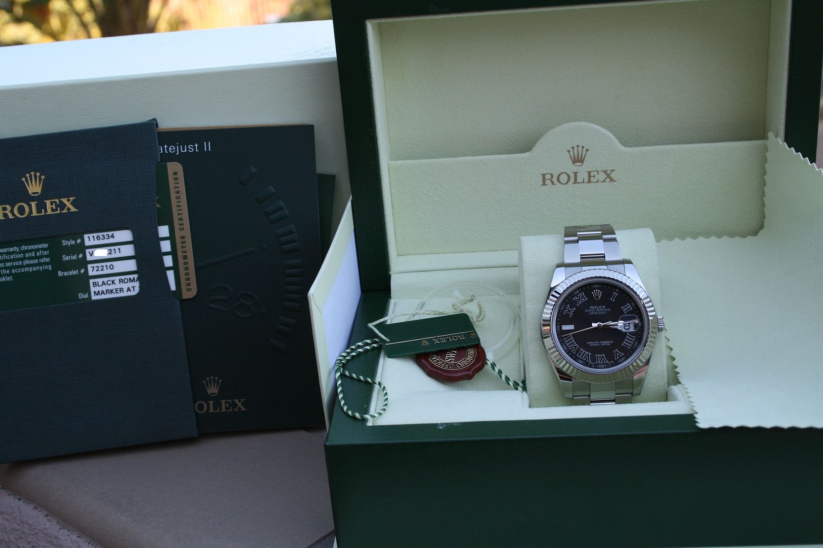 ![]() I am selling a Mint Rolex Datejust II 41mm model 116334 in mint. The watch comes with the black Roman Dial with Marker at 9. The watch comes complete as seen in pictures. $6895 Delivered or face to face in San Diego Modern Rolex trade are accepted and also accepting GIA Certified Diamonds 1ct and up on trades also always looking to buy modern and complete Rolexes Email with questions: sdwatches@gmail.com Call or text me at: 619-339-5645 I am an independent watchdealer and a watch collector and I am not affiliated with Rolex USA in anyway..All my watches comes from various dealers here in the US and all over the world..All my watches are guaranteed authentic and will stand by its Authenticity. ![]() ![]() ![]() ![]() ![]() ![]() ![]() ![]() ![]()
