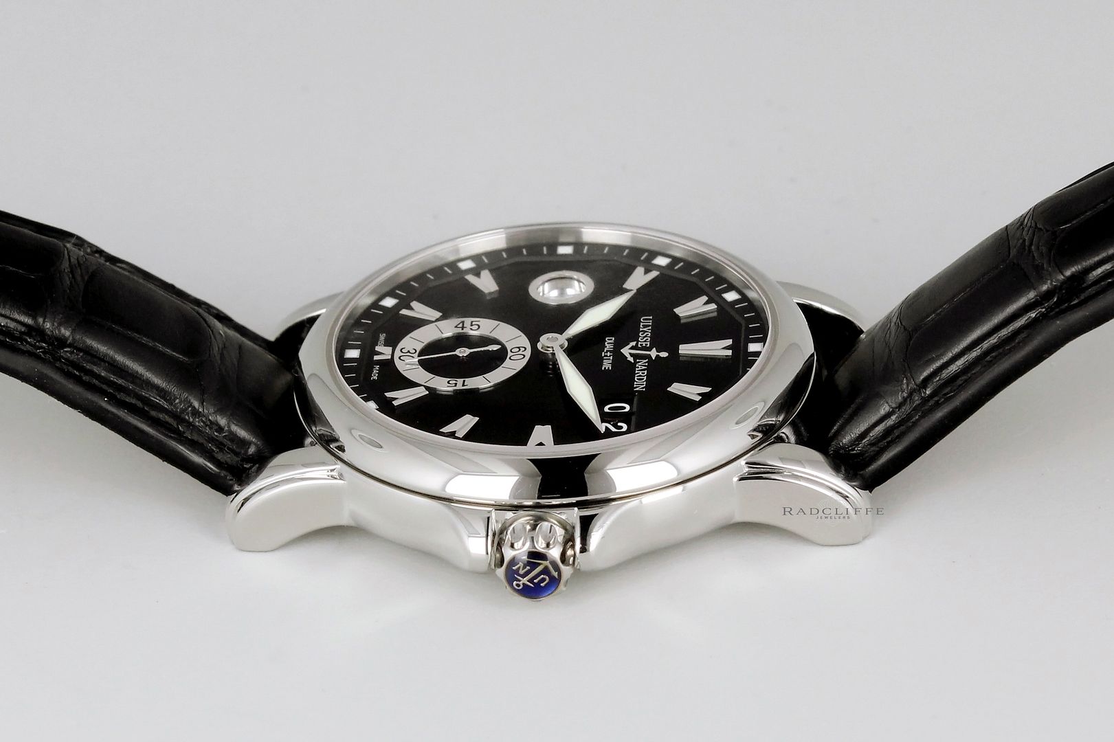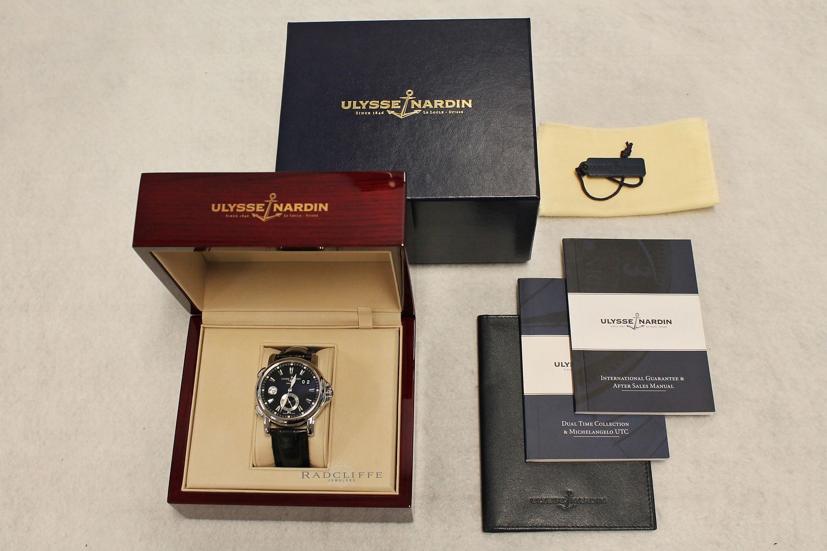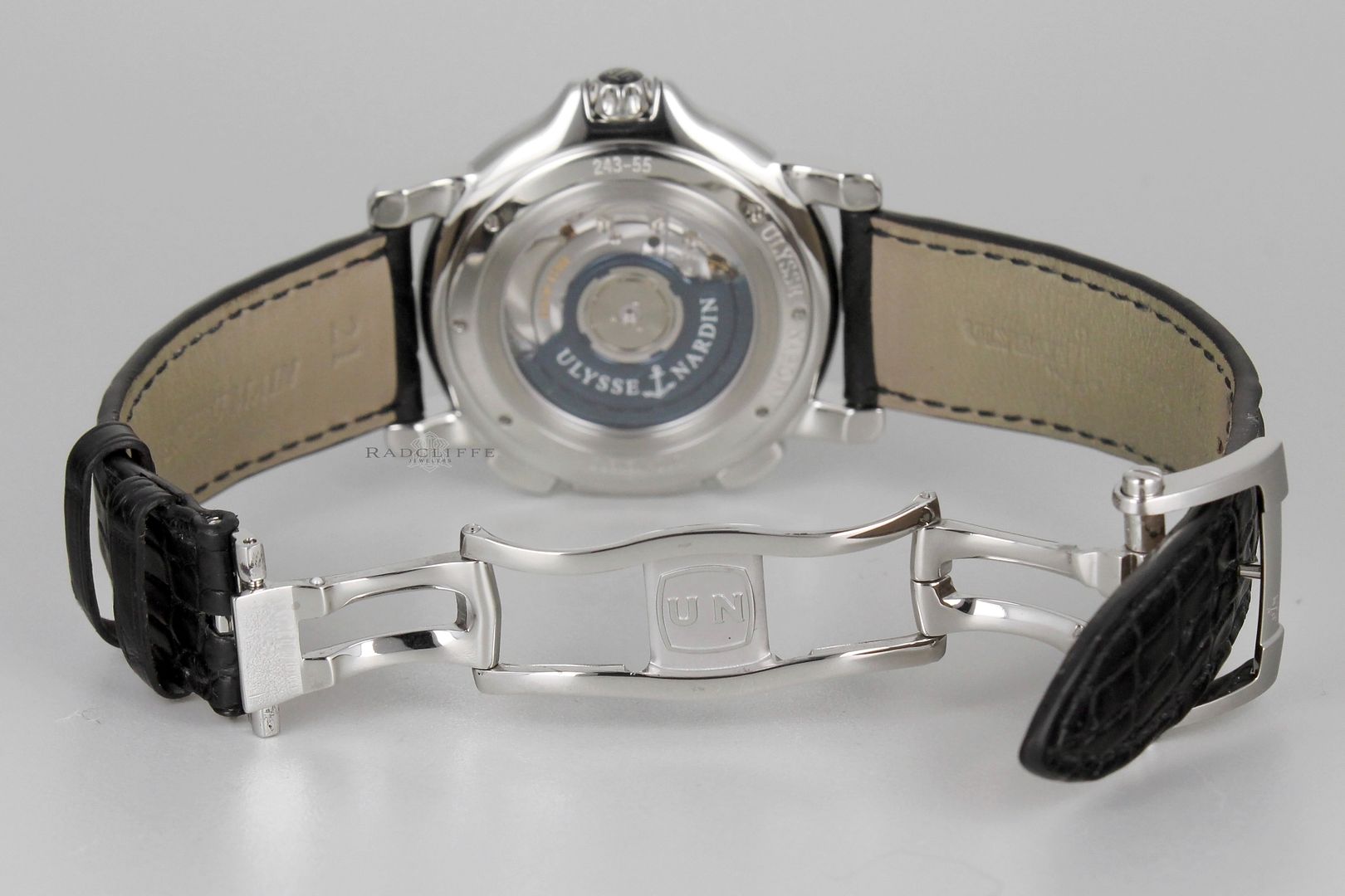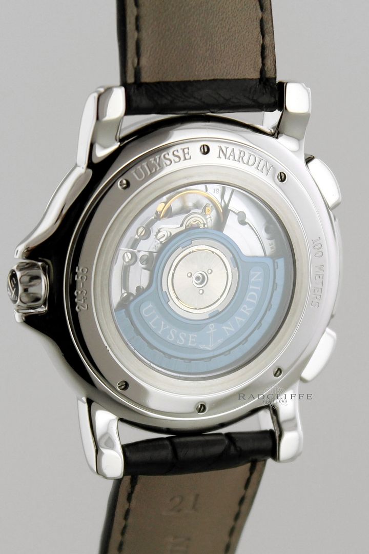 For sale is an excellent condition 42mm steel Ulysse Nardin. The 243-55 is on a UN black crocodile strap and steel deployment buckle. The strap has some wear, still a lot of life left. The UN comes with box and partial papers as shown; no warranty card. Was sold originally in 2006 by yours truly. The watch is running great, at +2 to +4 seconds a day, case is nice and clean as well. Shall come with 15 month in house warranty on the movement for $3925 or best offer
