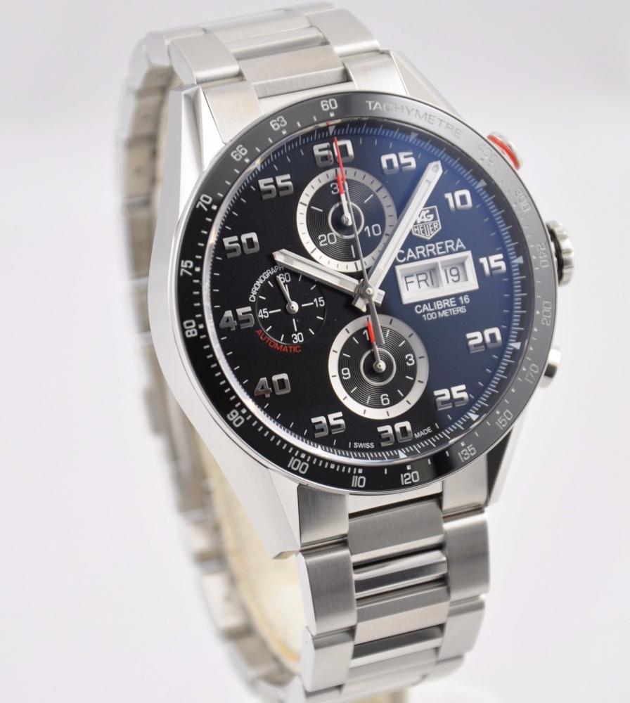 Reference #: CV2A1R.BA0799 The watch is new, never worn or sized. Comes with Tag Heuer boxes and papers. Case: Stainless steel case with ceramic tachymeter bezel Case back: Stainless steel Case dimensions: · Diameter: 43mm Dial: Black Movement: Tag Heuer Caliber 16 Automatic Crystal: Sapphire Water resistance: 100m/330ft Band: Steel Tag Heuer with fold clasp Functions: - Chronograph - Date and Day at 3 o' clock Many well known references are available. Payment via wire transfer only or face to face in Cincinnati, OH Price is $2,599+shipping
