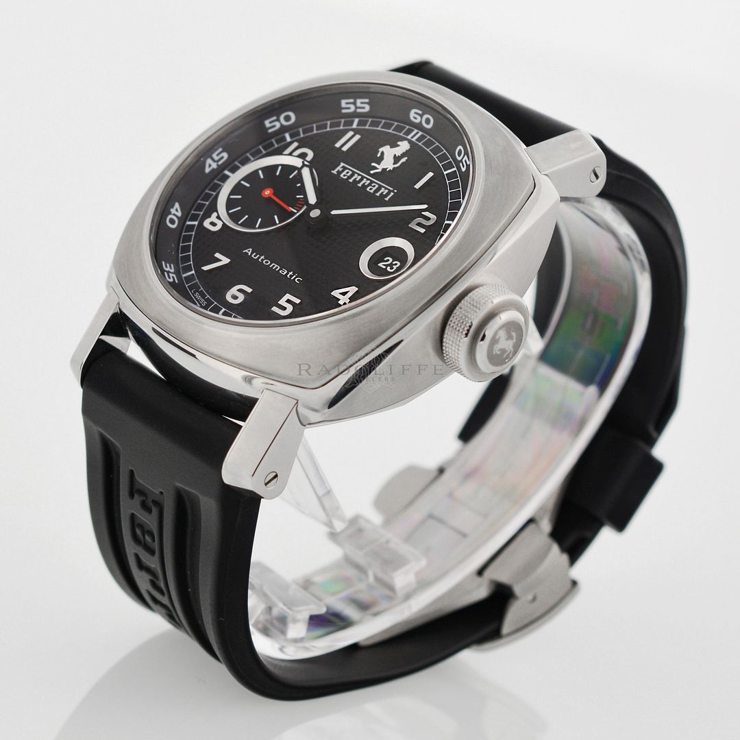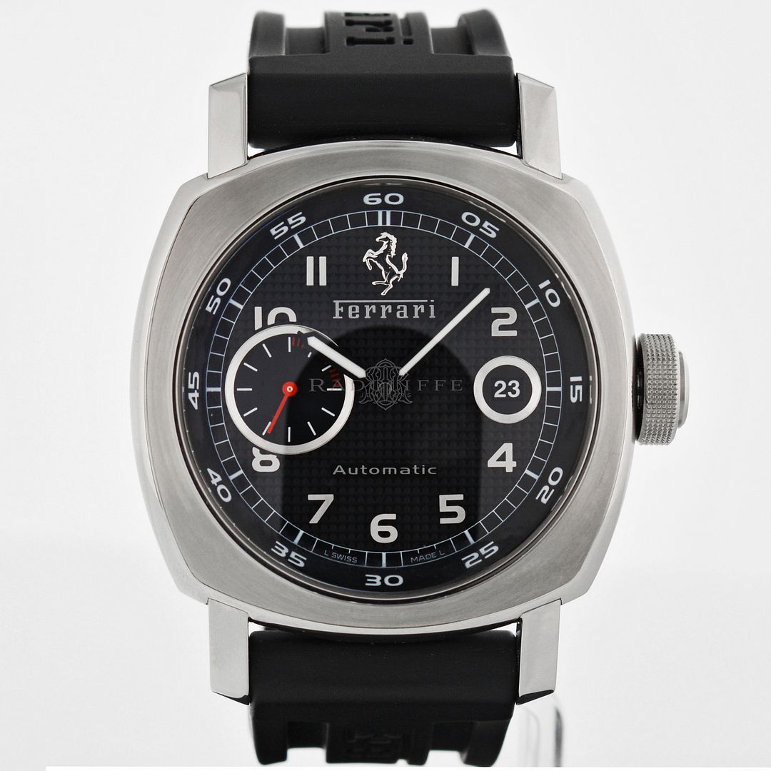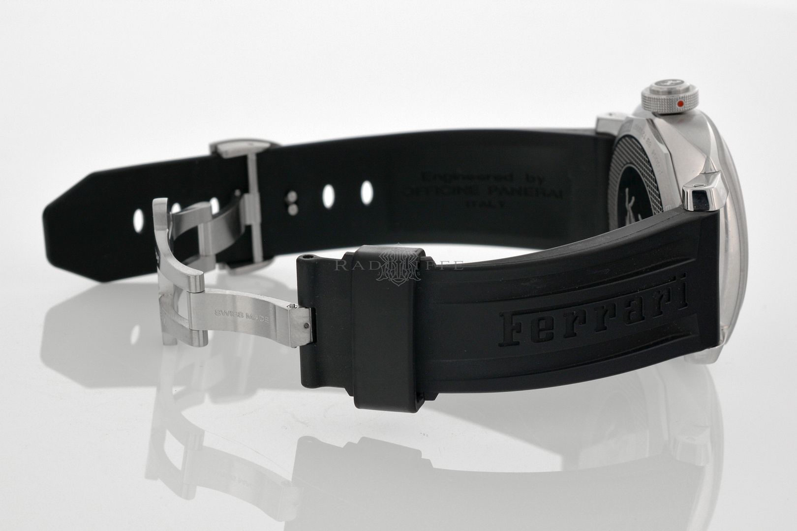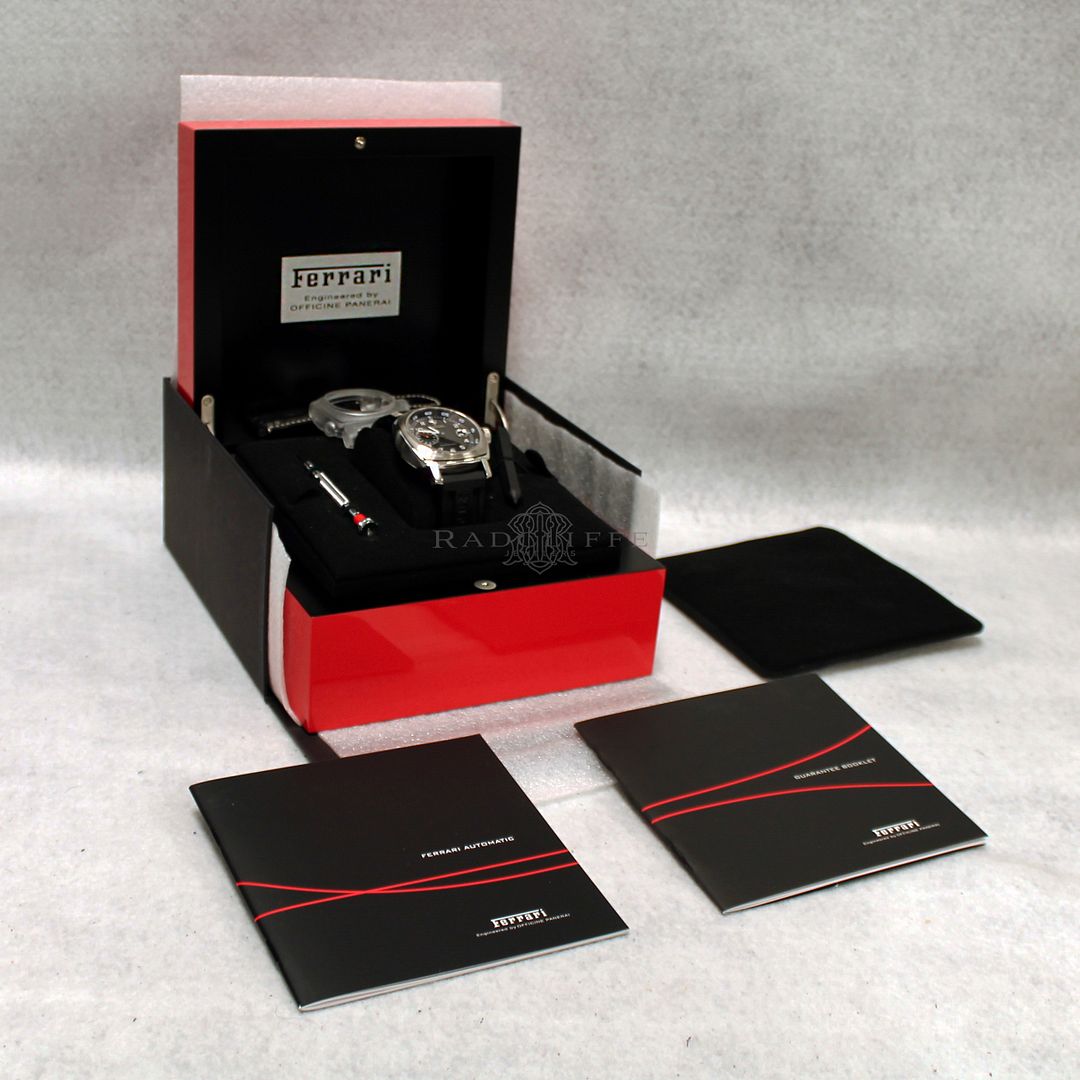 For sale is an excellent condition 45mm stainless steel Panerai Ferrari. The FER00001 comes with box, papers, bezel protector, screwdriver, partially broken strap changing tool, and mint extra black crocodile strap. The A serial Ferrari was purchased at a US AD and factory serviced in 2016. The Ferrari is on a like new OEM rubber strap and steel deployment buckle. The Ferrari has a black waffle dial with date display at 3 and small seconds at 9.