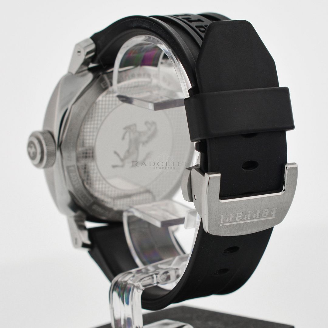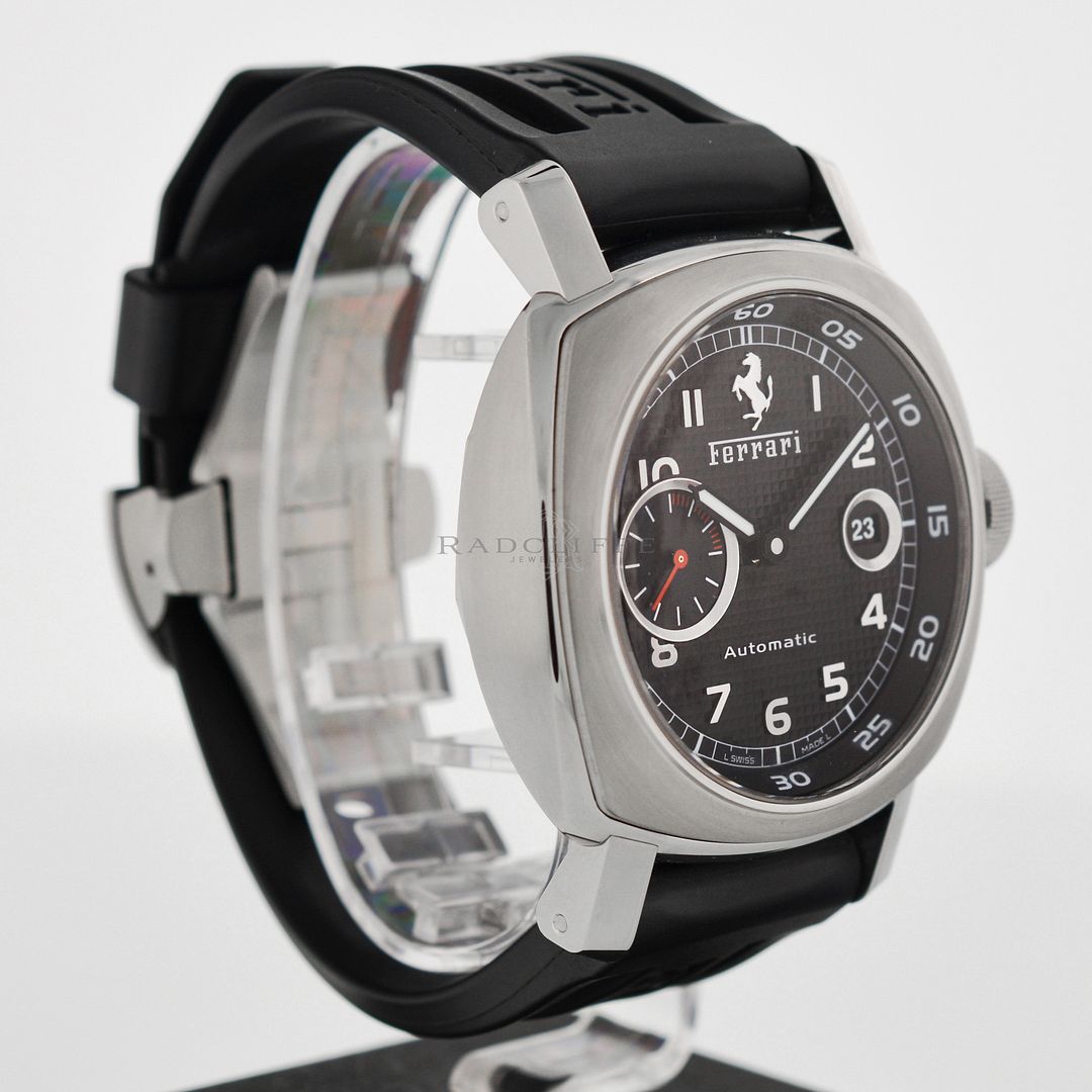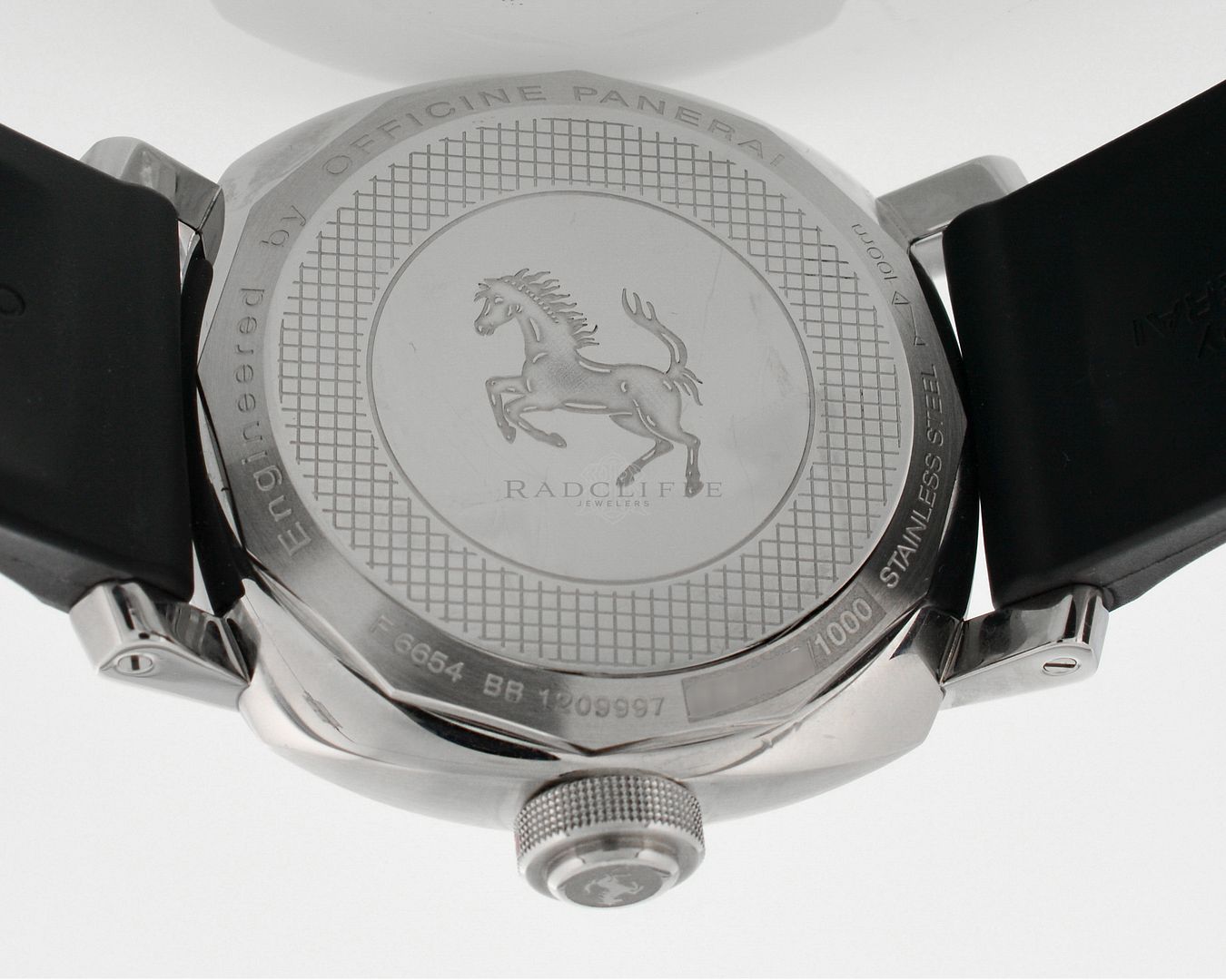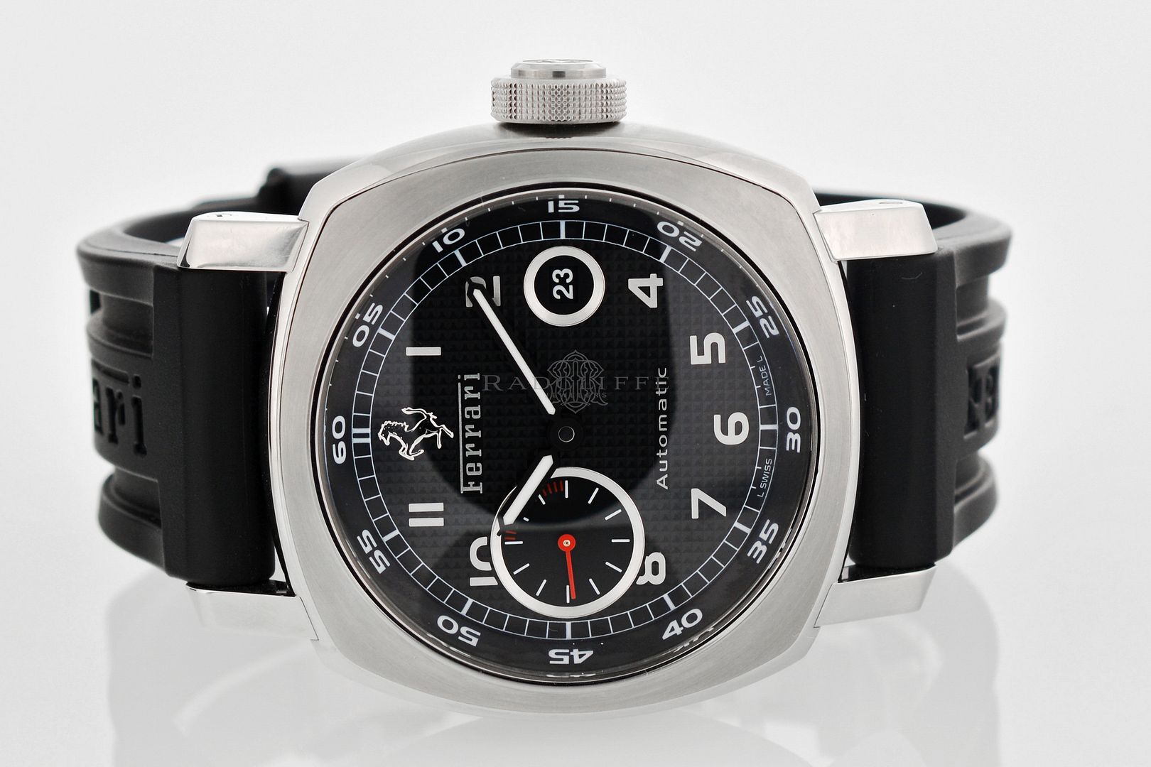 For sale is an excellent condition 45mm stainless steel Panerai Ferrari. The FER00001 comes with box, papers, bezel protector, screwdriver, partially broken strap changing tool, and mint extra black crocodile strap. The A serial Ferrari was purchased at a US AD and factory serviced in 2016. The Ferrari is on a like new OEM rubber strap and steel deployment buckle. The Ferrari has a black waffle dial with date display at 3 and small seconds at 9.