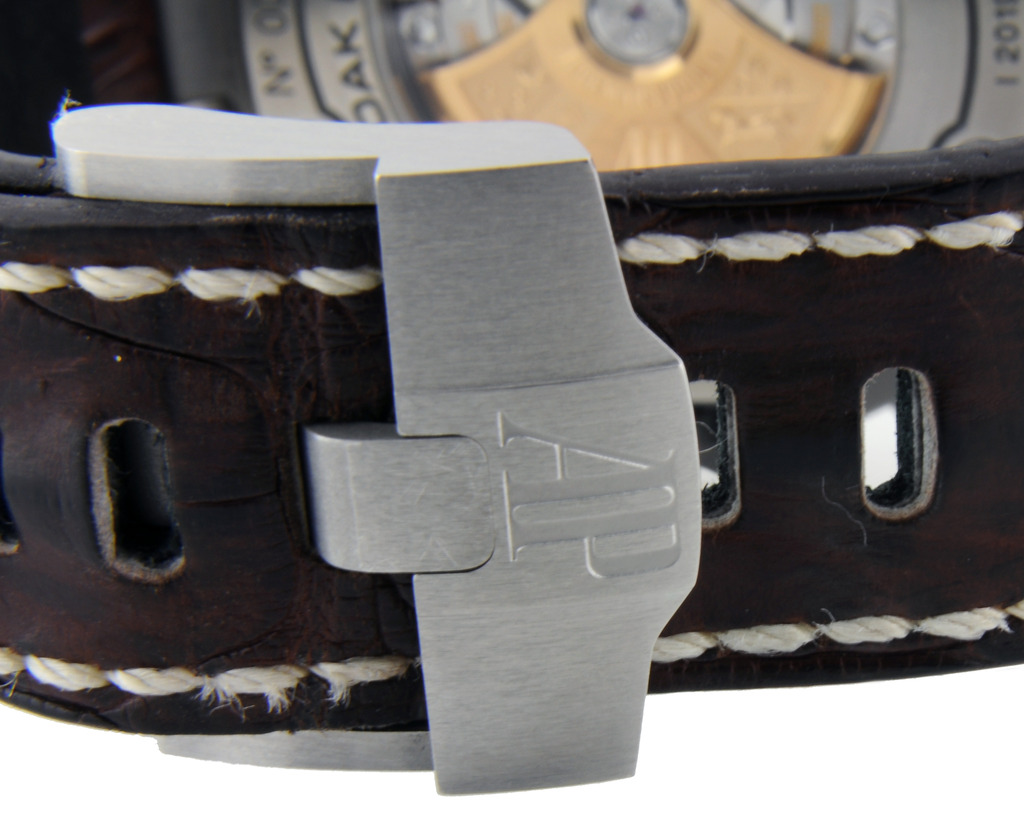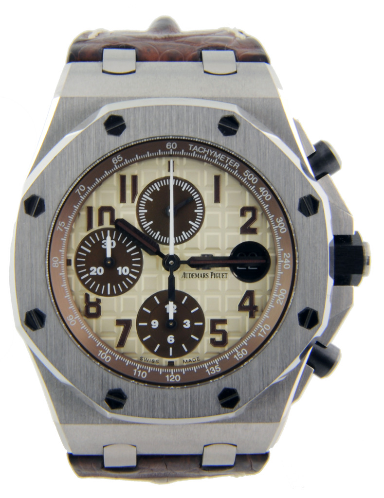 For sale today is a very mint Audemars Piguet Royal Oak Offshore Safari model number 26470ST.OO.A801CR.01 with a 42mm steel case and display back. Cream dial with brown accents and brown hornback strap with white stitch and a tang buckle. The watch is an I serial and comes fully complete with all box and papers and will be delivered with a 1 year warranty at $16,750