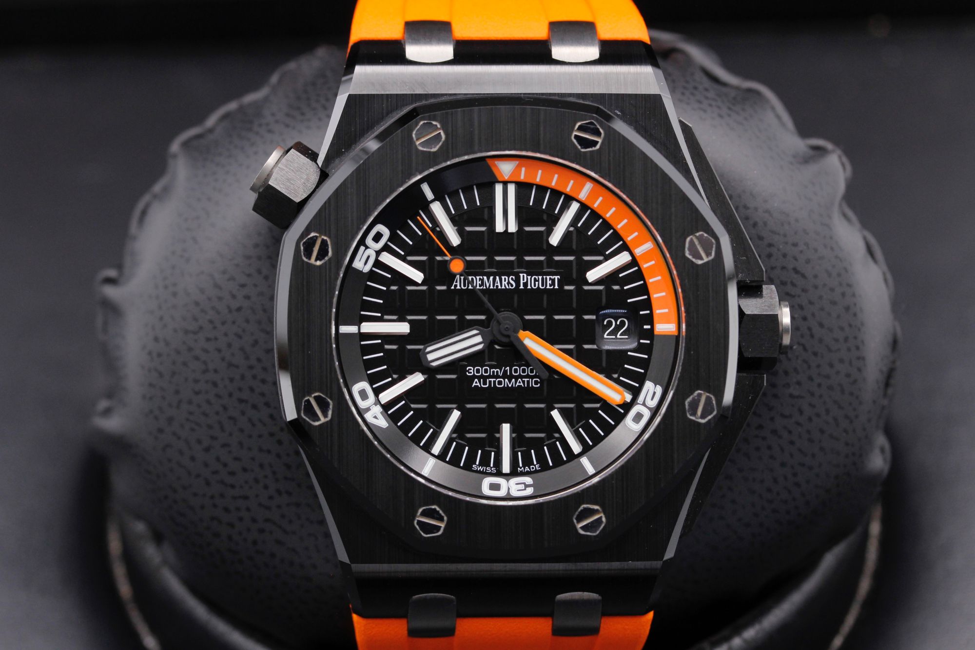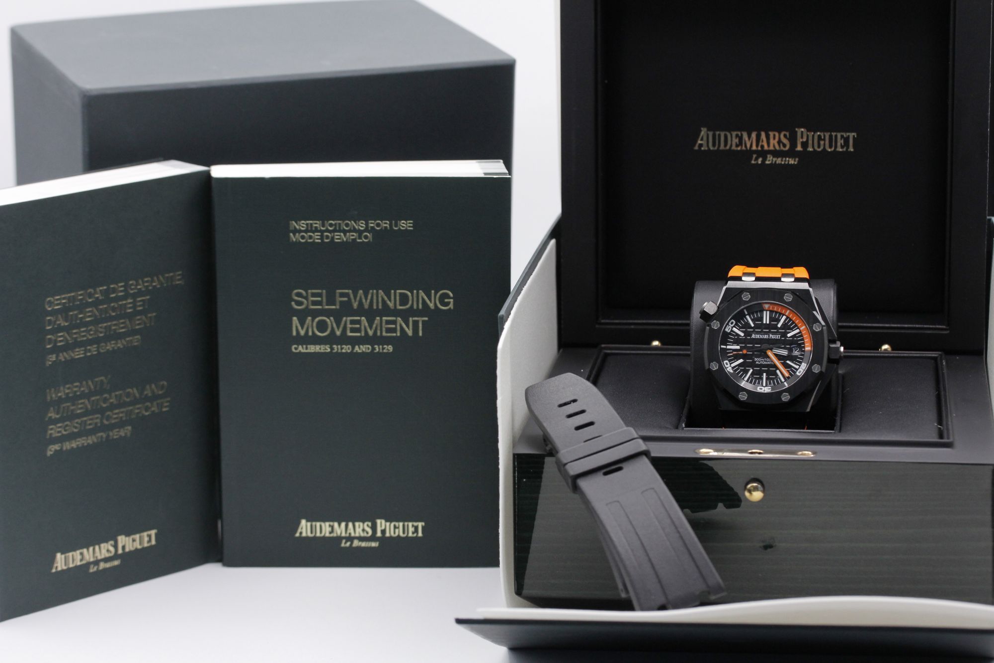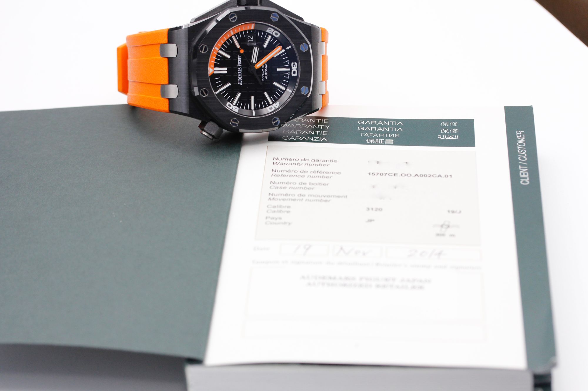 Brand: Audemars Piguet Model: Royal Oak Offshore Diver Reference: 15707CE.OO.A002CA.01 Condition: Pre-Owned Grade: Mint Case Size: 42mm Material: Ceramic Dial: Black Bracelet Type: Rubber Movement: Automatic - Date Serial: I Age: Modern Box: Yes Papers: Yes Additional Notes: Warranty Booklet Dated - November 2014 **Please Note** The serial numbers have been blurred in the photos, for security & privacy. However, they are fully present. Wire Price $29,895.00 Shipped and Insured in the CONUS Many world wide references available All Watches Are Available For Inspection or Pickup By Appointment At: OC Watch Guy 16832 Pacific Coast Highway Huntington Beach, CA 92649 562.592.6294 I am open to trades of 1ct & up GIA Diamonds, modern Rolex, Panerai, Audemars Piguet, Patek Philippe & IWC watches! I welcome a face to face in Southern California I am always a cash buyer for your 1ct & Up GIA Diamond, New or Pre-Owned Rolex, Audemars Piguet or Patek Philippe For questions please call/text Patrick: 714-353-9539 email: Patrick@ocwatchguy.com or Info@ocwatchguy.com *All my watches are guaranteed authentic and I standby their authenticity, 100%!